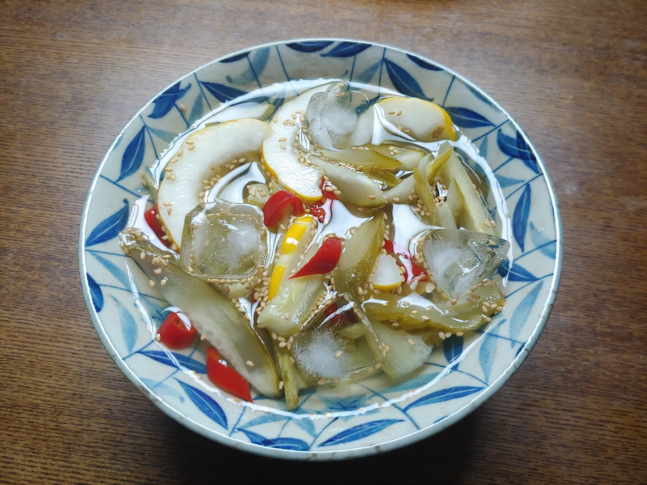 올여름엔 새로운 절임 반찬을 해봤어요. 어머니께서 참외와 오이를 함께 넣고 식초, 소금, 올리고당을 넣어 새콤달콤하게 절여서 한 통 만드셨어요. 빨갛고 초록 고추도 넣어서 색감도 알록달록 예쁩니다. 이 반찬이 간단하고 좋은 이유는 간단히 물만 섞으면 바로 냉국으로 만들어 먹을 수 있고, 참기름과 고춧가루를 넣고 무침을 만들기에도 좋거든요. 그래서 여름 내내 오이와 참외 절임으로 잘 먹었습니다.