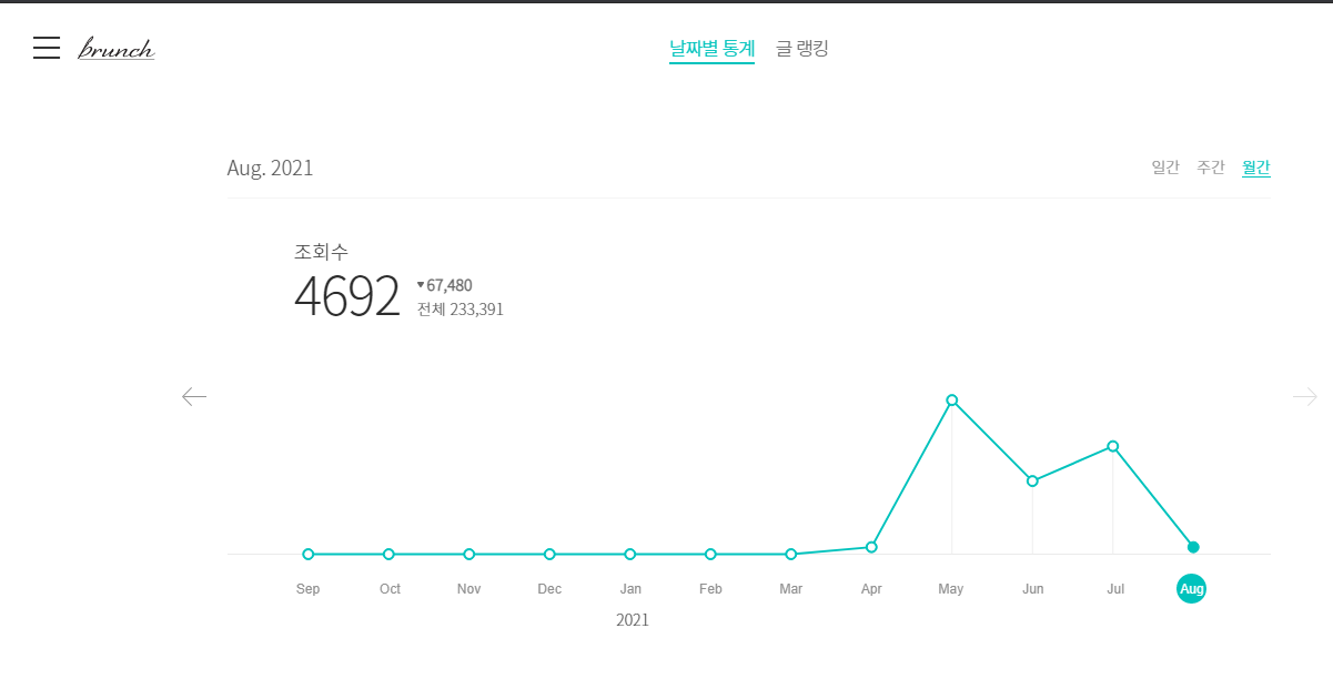 브런치에 난다 긴다 하는 작가님들 많은 거 압니다. 그래도 제가 첫 글을 올린 날이 4월 19일이고, 누적 조회수 1만 회가 넘었다고 혼자 파스타에 와인으로 자축하던 날이 5월 10일이었거든요? 그리고 8월 13일 오후 10시 40분 기점으로 누적 조회수는 233,391(이십삼만삼천삼백구십일) 명이 되었습니다.