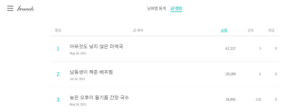 글 랭킹을 보시는 바와 같이 조회수가 많은 글 1~3위는 <식탁을 채우는 이야기>에 연재된 글입니다. 확실히 음식과 일상의 기록이 많은 공감대를 불러일으킨 것 같습니다.
