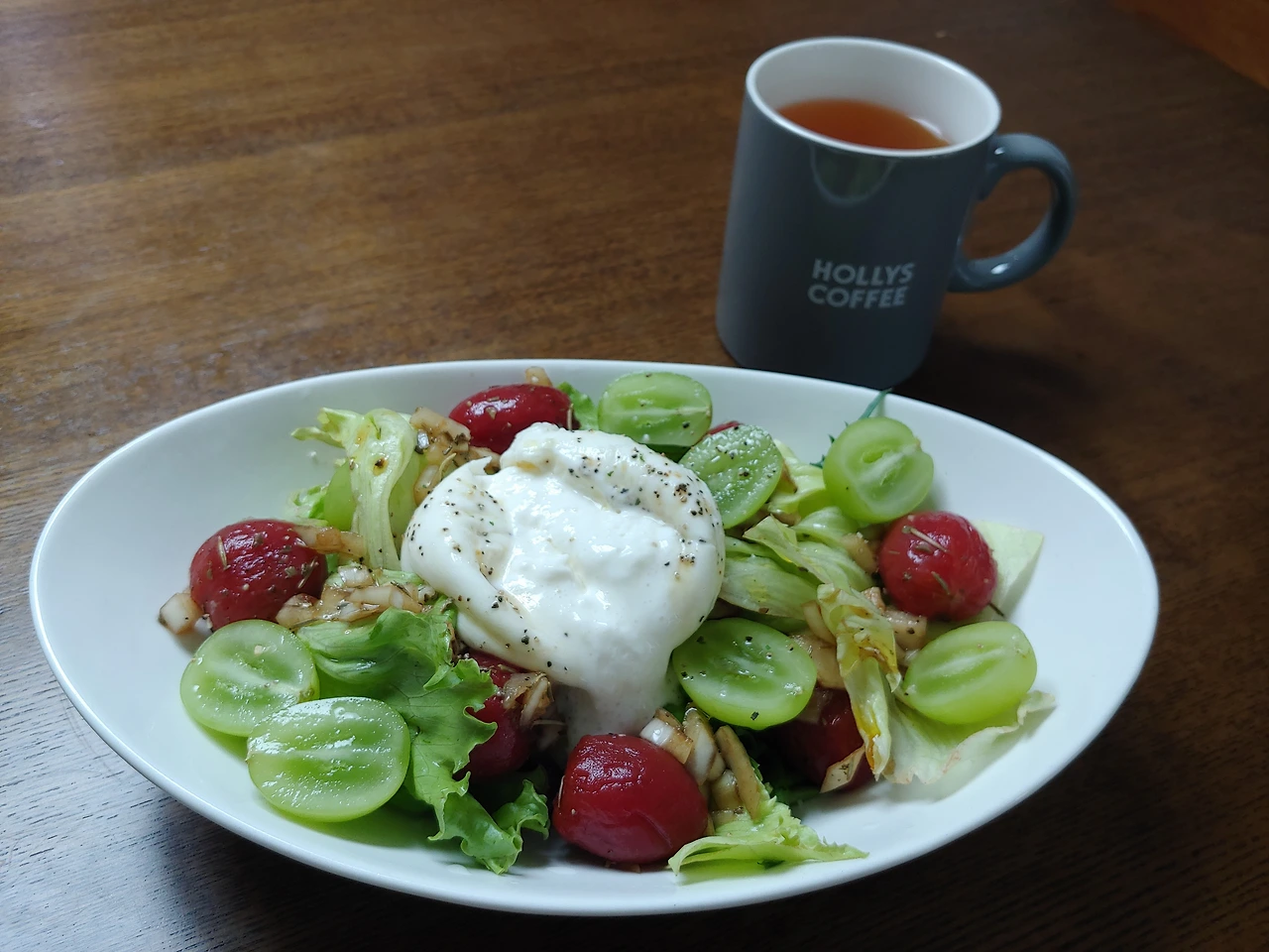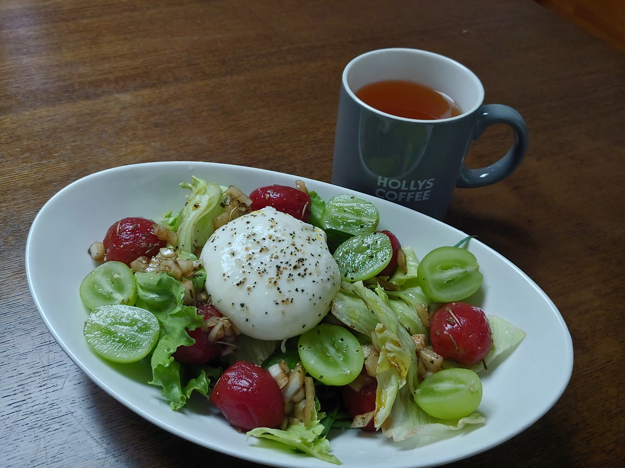 토마토와 포도를 같이 먹는 데는 이유가 있는 것 같아요. 토마토는 채소 중에 나트륨 함량이 높은 편이어서 꽤나 짭짤한 맛이 나고 포도는 당도가 높으니 단짠의 채소 과일 조합이죠. 여기에 부드러운 크림 같은 부라타 치즈가 합쳐지니 입안에서 조화로울 수밖에 없죠! 시원한 채소 샐러드만 먹으면 소화가 잘 안될 것 같아서 따뜻한 레몬 홍차를 곁들였습니다. 날이 아무리 더워도 매일 찬 것만 먹으면 배앓이를 하니까요.
