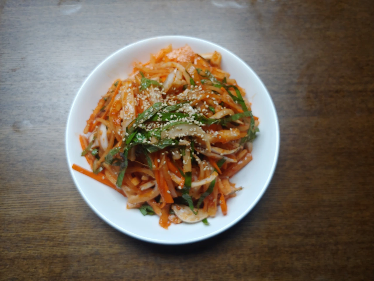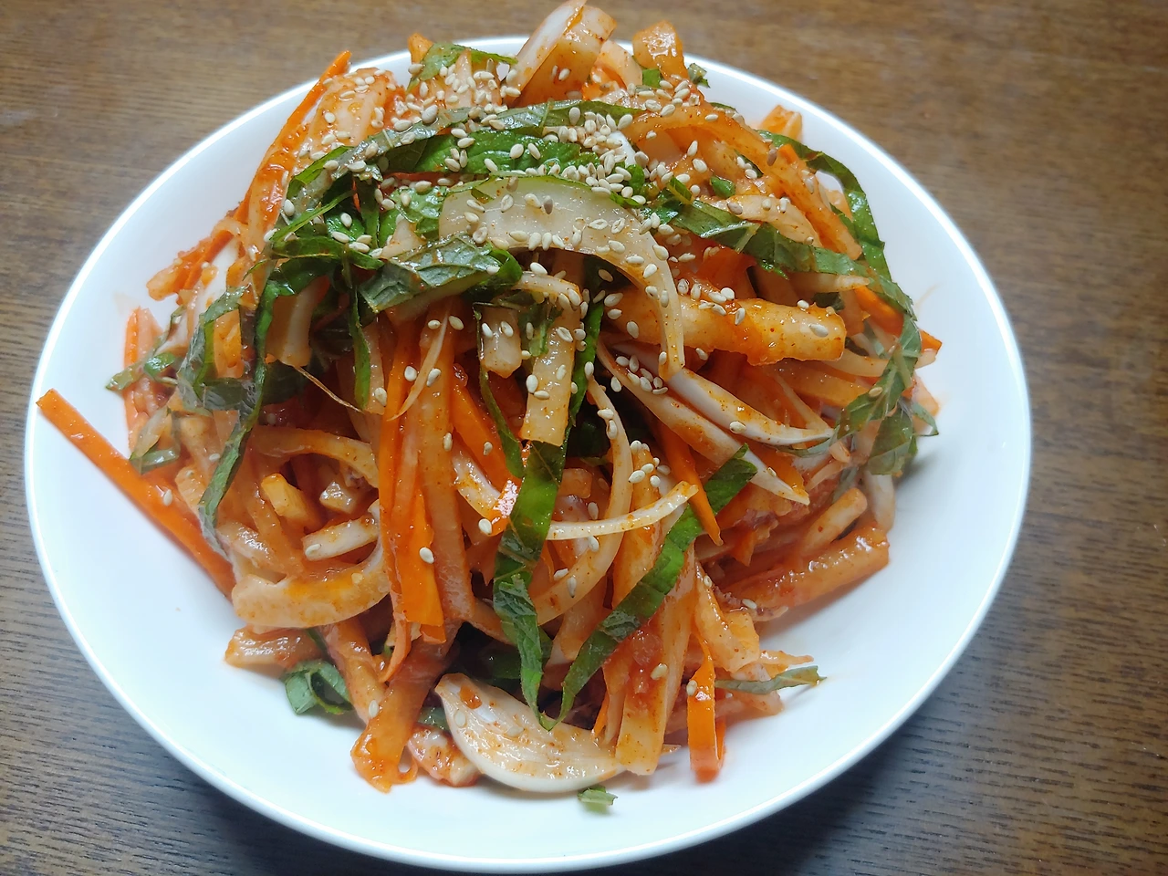 준비한 재료를 큰 볼에 담고 초장을 적당히 넣어서 가볍게 무쳐줍니다. 접시에 한가득 담아주고 참기름 살짝 둘러서 통깨를 뿌려줍니다. 만들 때는 힘들었는데 막상 오징어 초무침을 먹으니 맛이 좋아요. 그러니 이런 수고로움을 반복하죠.