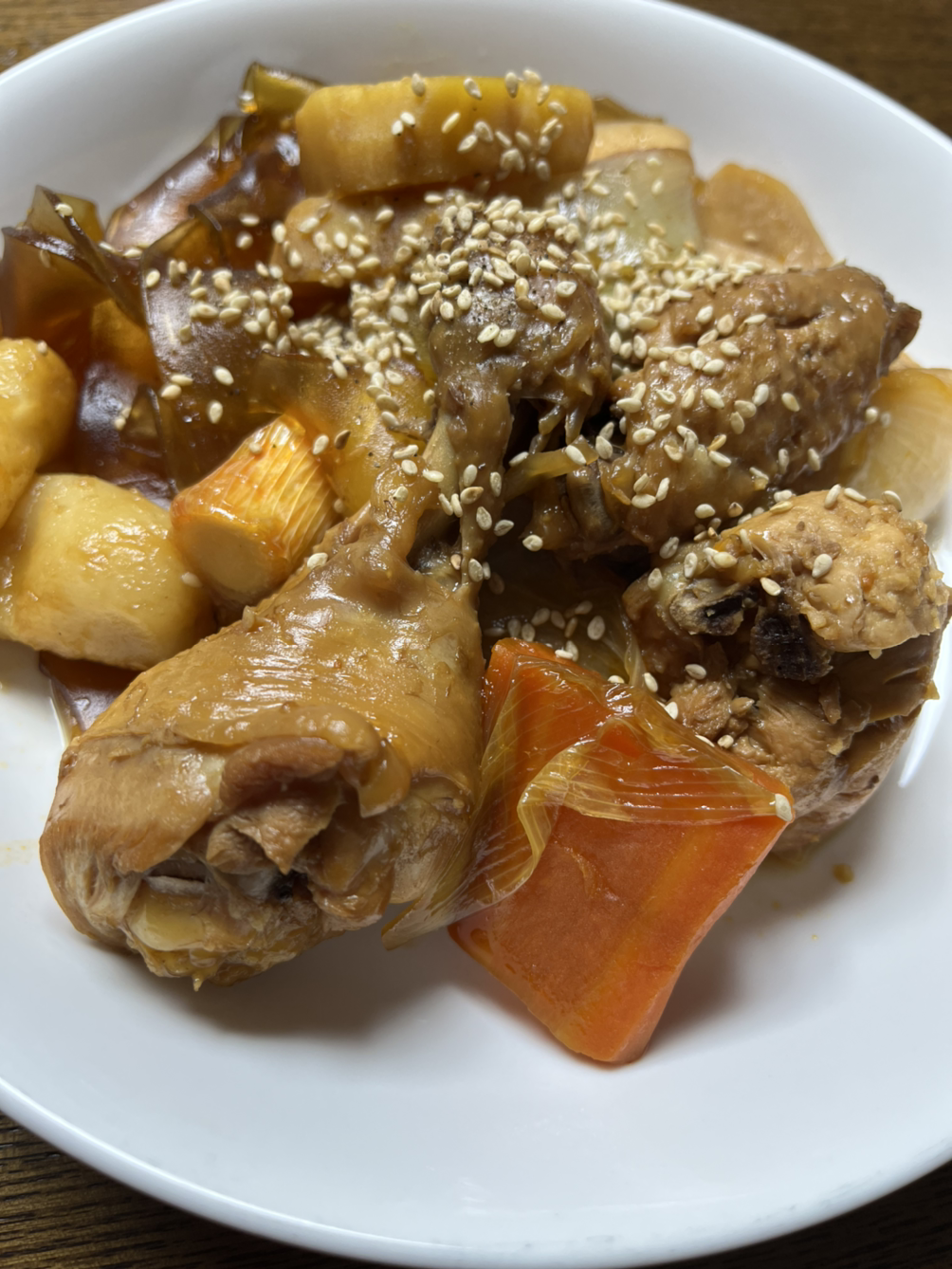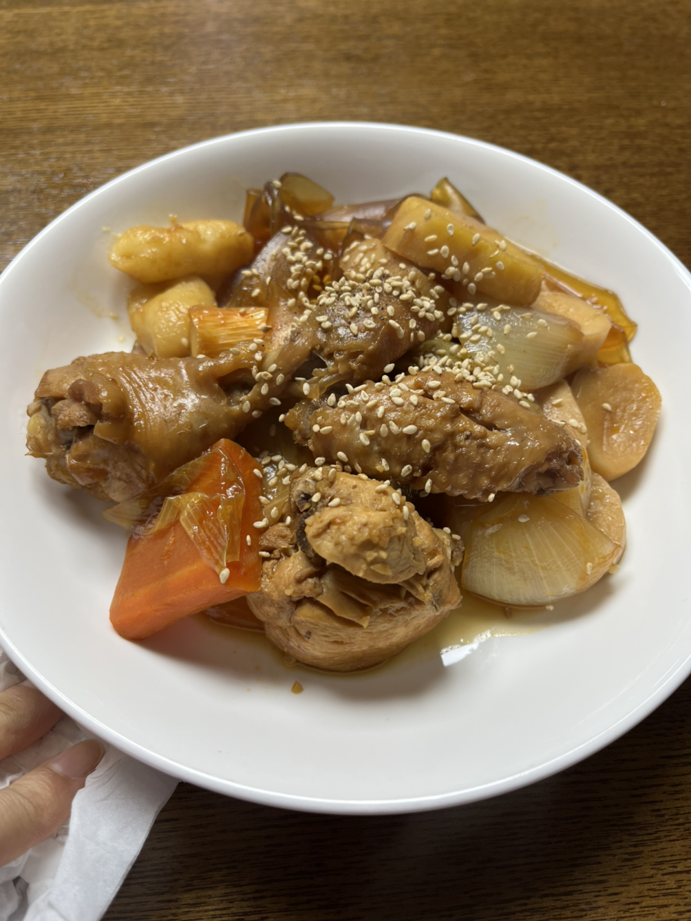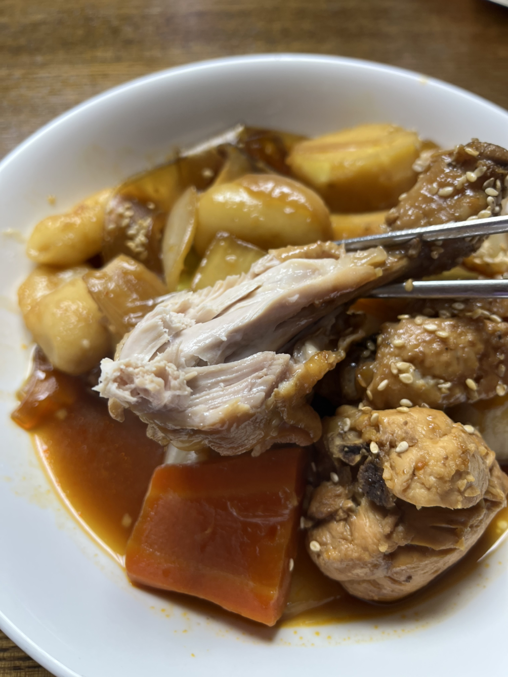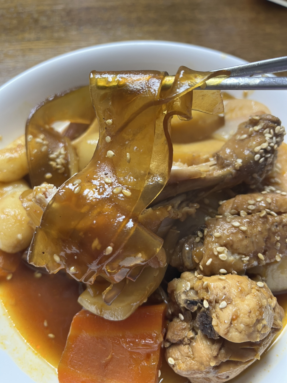 뜨거운 물에 데친 후 깨끗하게 씻어준 닭고기 살에 종이컵 기준으로 간장 1컵, 콜라 2컵, 물 4컵에 설탕을 1스푼 넣고 끓여줍니다. 콜라를 넣으면 독특한 풍미와 색을 내주고 콜라 속 인산이 고기를 부드럽게 해 줍니다. 소스가 끓으면 고구마와 당근 같은 단단한 채소를 넣어 10분 정도 끓여주세요. 10분 후에 양파, 대파, 새송이 버섯을 넣고 또 5분 정도 끓여줍니다. 그 후에 병으로 파는 불닭 소스를 한 스푼 넣어줘요. 이게 바로 오늘의 시크릿 소스, 비법이 되겠네요! 이전에 마른 고추나 페페론치노를 넣어보기도 했지만 불닭 소스 한 스푼을 넣는 게 제일 매콤하더라고요. 불닭소스로 간편하게 감칠맛 나는 매운맛을 줍니다. 다진 마늘을 크게 한 스푼 넣고 불린 당면과 치즈떡을 넣어주세요. 불은 중불로 하고 당면이 부드러워지면 참기름이나 통깨를 조금 뿌려 마무리합니다.
