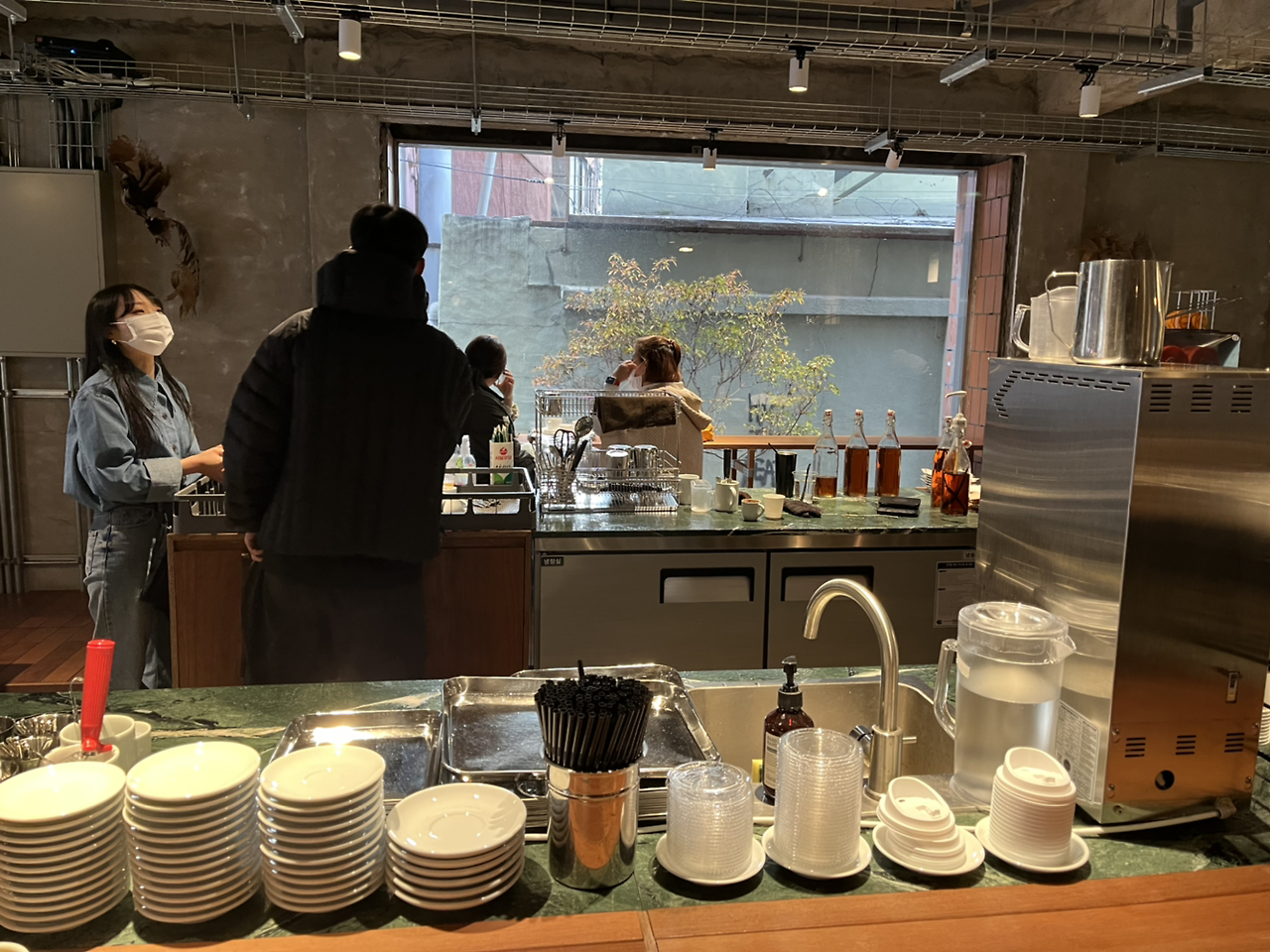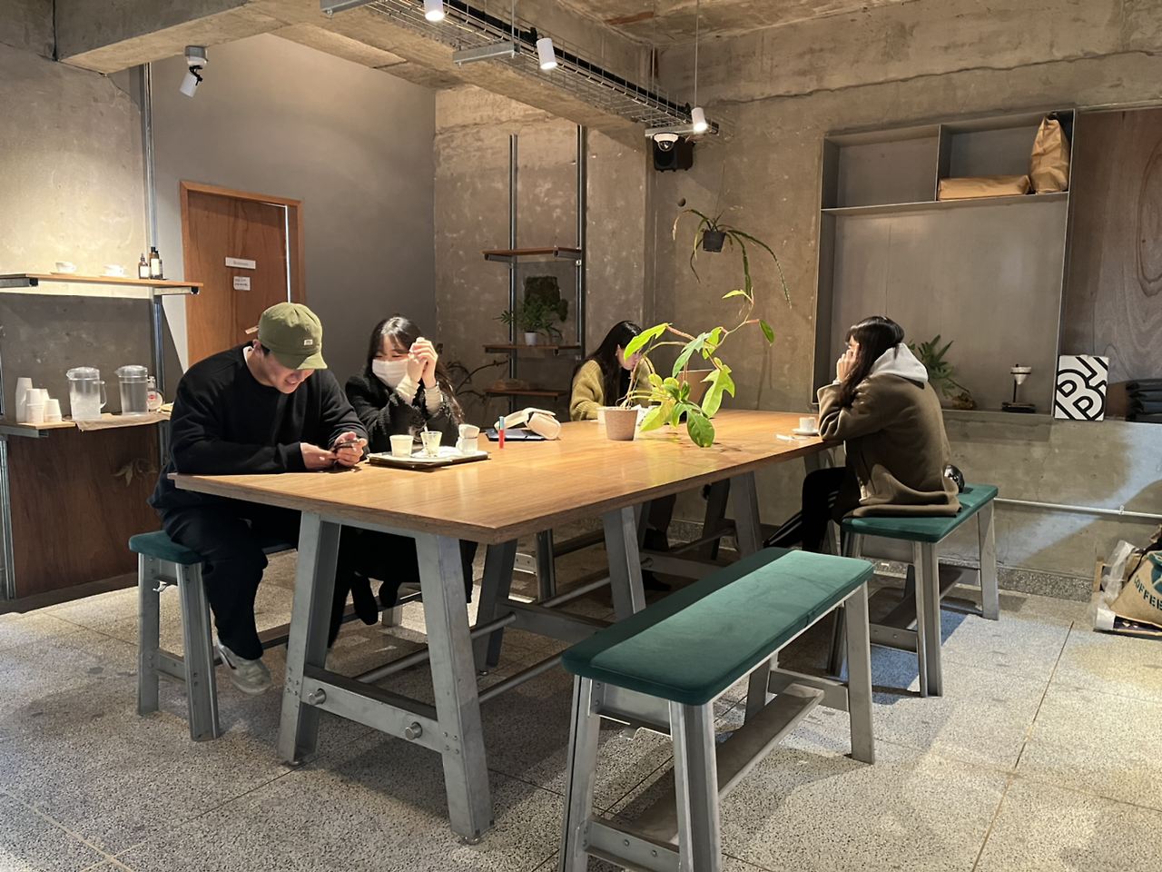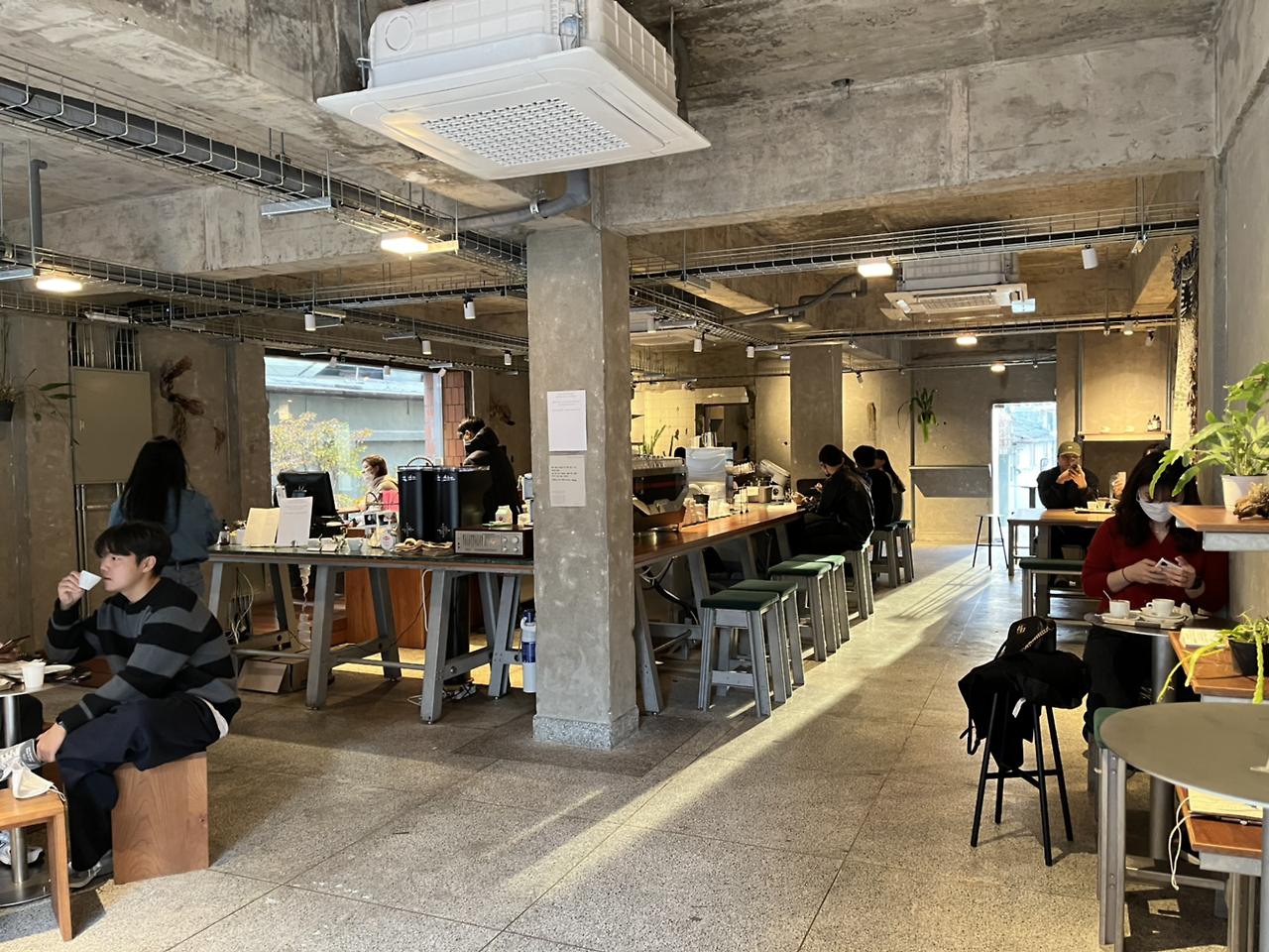 앉아서 공부를 하거나 작업을 할 수 있는 넓은 책상과 바, 테이블이 있어 원하는 방식으로 커피를 마실 수 있습니다. 바리스타와 대화를 할 수도, 일에 집중할 수도, 친구와 대화를 나눌 수도 있다는 거죠. 아쉬운 점은 사장님으로 보이는 분이 패딩을 입고 일하고 계시더라고요. 다른 바리스타들도 저마다 착장이 다른 걸로 보아 별다른 드레스코드는 없는 것 같아요. 잘 갖춰 입은 옷이 아니더라도 단정한 옷에 앞치마를 착용하시는 게 더 좋지 않았을까요?