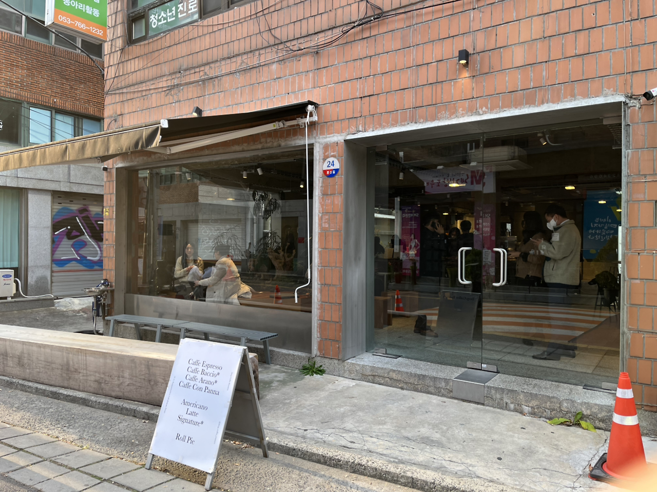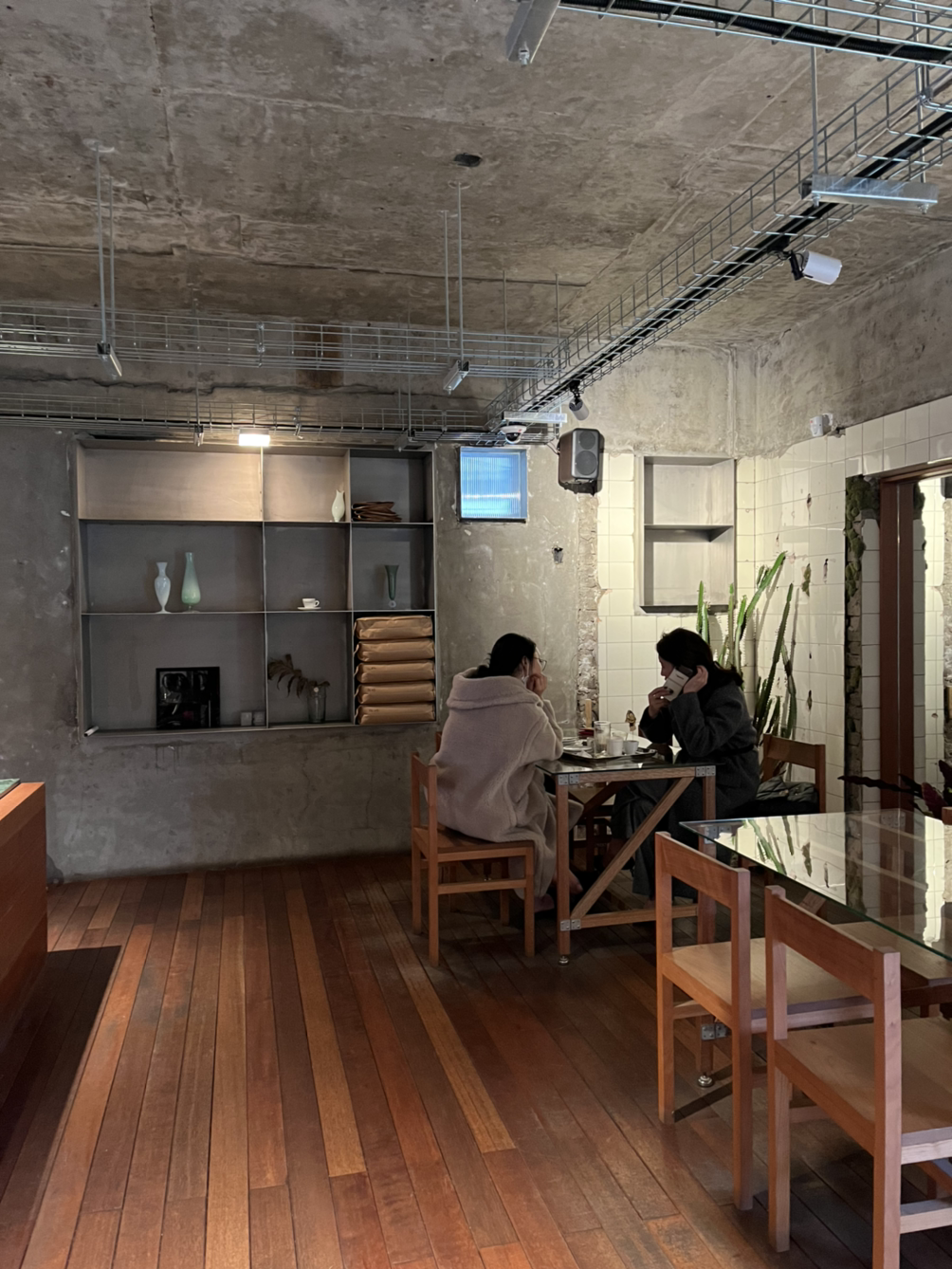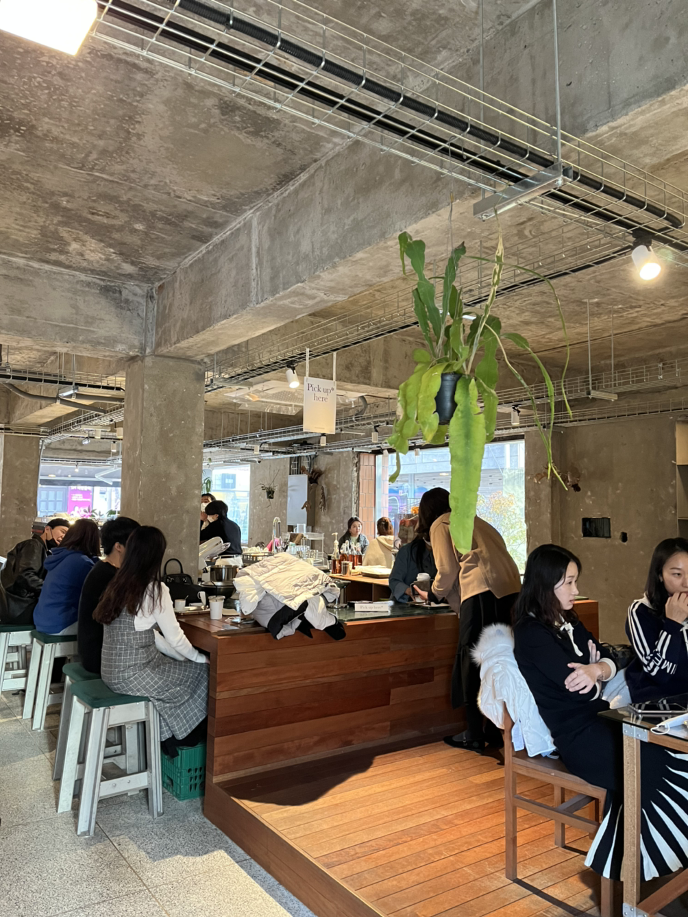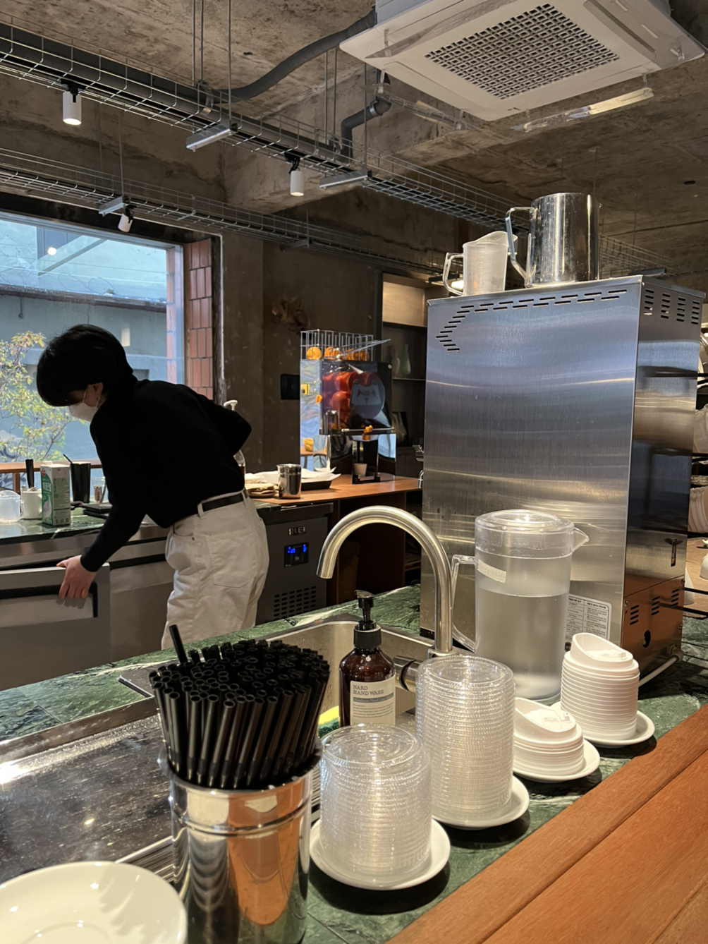앉아서 공부를 하거나 작업을 할 수 있는 넓은 책상과 바, 테이블이 있어 원하는 방식으로 커피를 마실 수 있습니다. 바리스타와 대화를 할 수도, 일에 집중할 수도, 친구와 대화를 나눌 수도 있다는 거죠. 아쉬운 점은 사장님으로 보이는 분이 패딩을 입고 일하고 계시더라고요. 다른 바리스타들도 저마다 착장이 다른 걸로 보아 별다른 드레스코드는 없는 것 같아요. 잘 갖춰 입은 옷이 아니더라도 단정한 옷에 앞치마를 착용하시는 게 더 좋지 않았을까요?