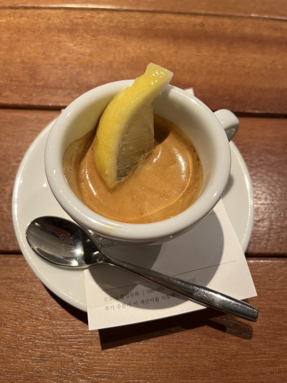에스프레소에 한 스푼의 설탕과 레몬 한 조각을 넣어줍니다. 빠르게 저어 설탕과 에스프레소를 마시고 레몬을 한 입 베어 물면 됩니다. 에스프레소의 쓴 맛은 전혀 느껴지지 않고 입안이 깔끔해지는 맛이에요. 깊이 음미하기도 전에 에스프레소 샷이 사라지는 게 아쉬울 정도인데 설탕이 아래쪽에 깔려서 마지막에는 바삭바삭하게 씹히는 재미가 있습니다. 설탕의 단맛과 레몬의 상큼함 덕에 에스프레소의 쓴맛 없이 정신이 번쩍 드는 한잔의 커피 같아요.
