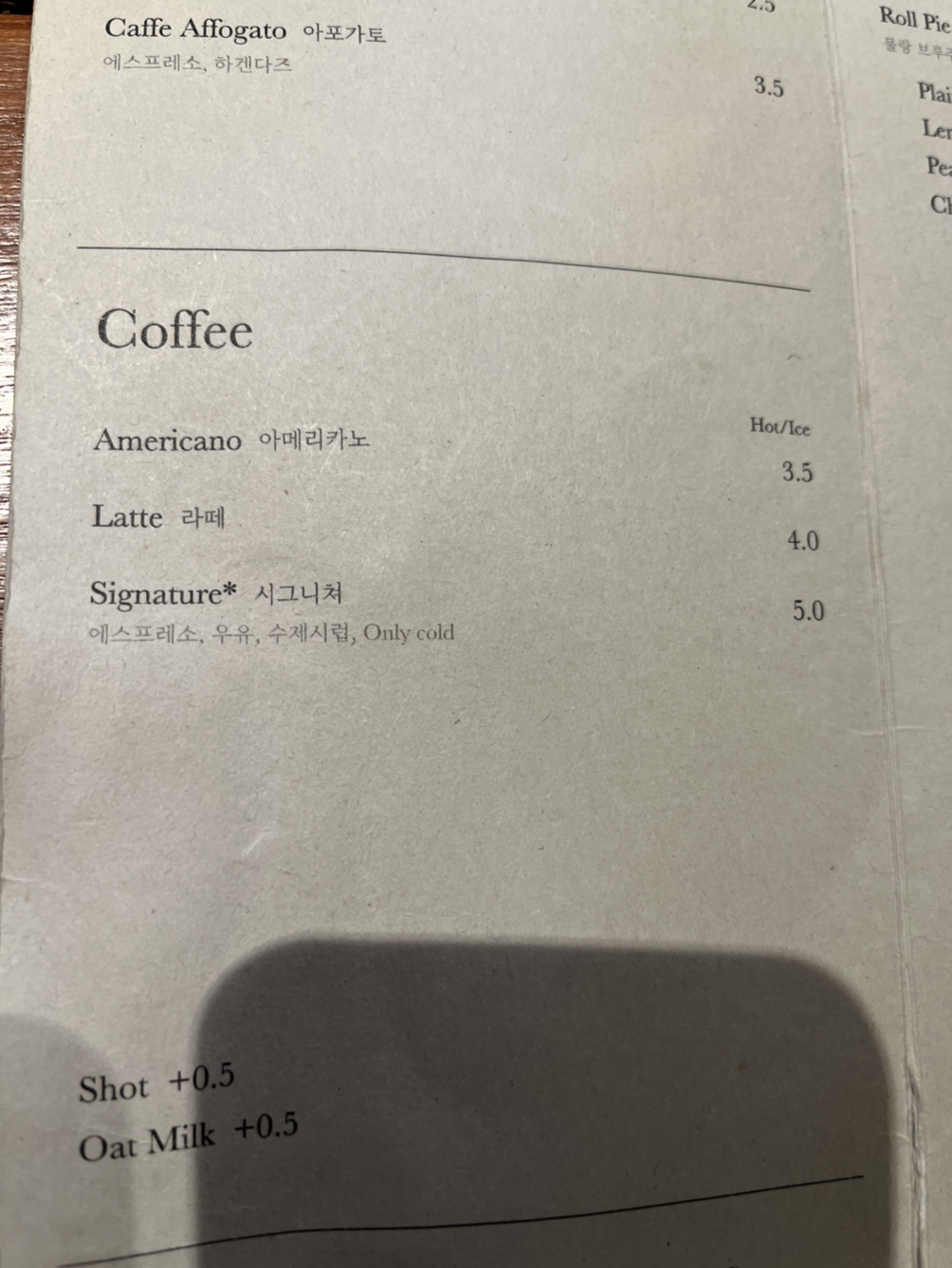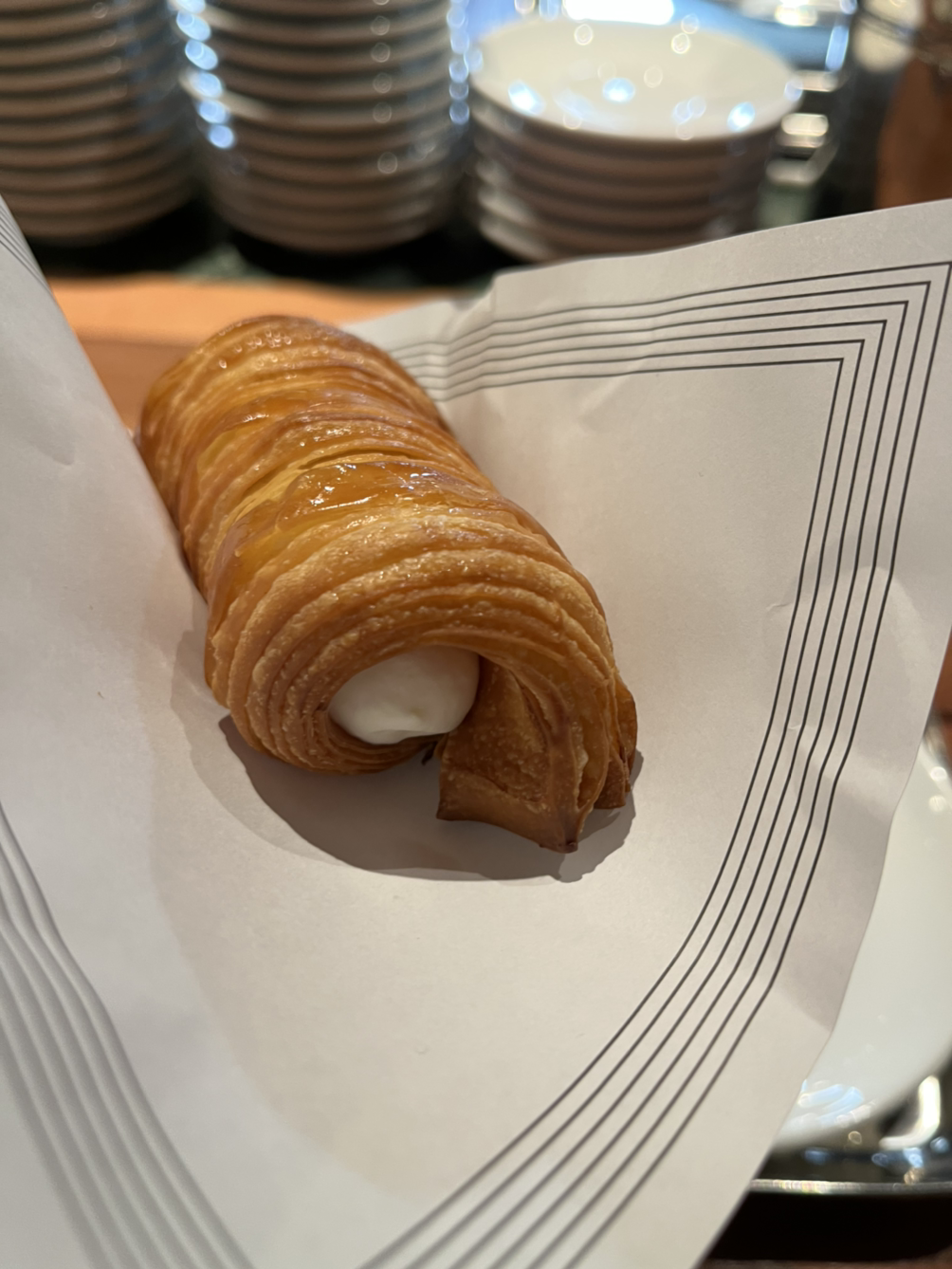고소하면서 쌉쌀한 맛이 강한데 에스프레소의 쓴 맛은 아니고 코코아 분말의 쌉쌀한 맛이 느껴집니다. 바치오 한 잔과 초콜릿 크림을 넣은 롤 파이를 먹으면 '깊은 초콜릿의 풍미를 느낄 수 있지 않을까?' 하는 기대가 있어요. 거의 한 모금 정도로 끝나는 에스프레소의 양이라 크림과 에스프레소가 섞여 있는지 아니면 따로 먹는지에 따라 손님이 느끼는 차이가 클 것 같습니다.