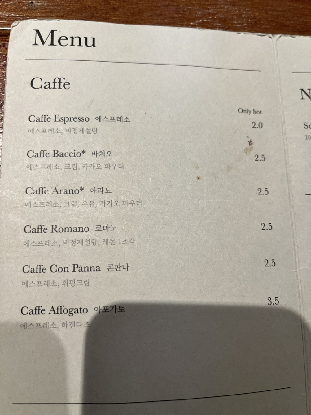 메뉴 : 에스프레소 (2.0) 바치오(2.5) 로마노(2.5) 아라노(2.5)