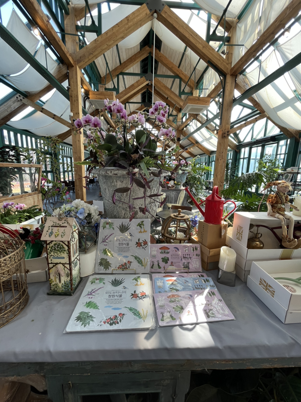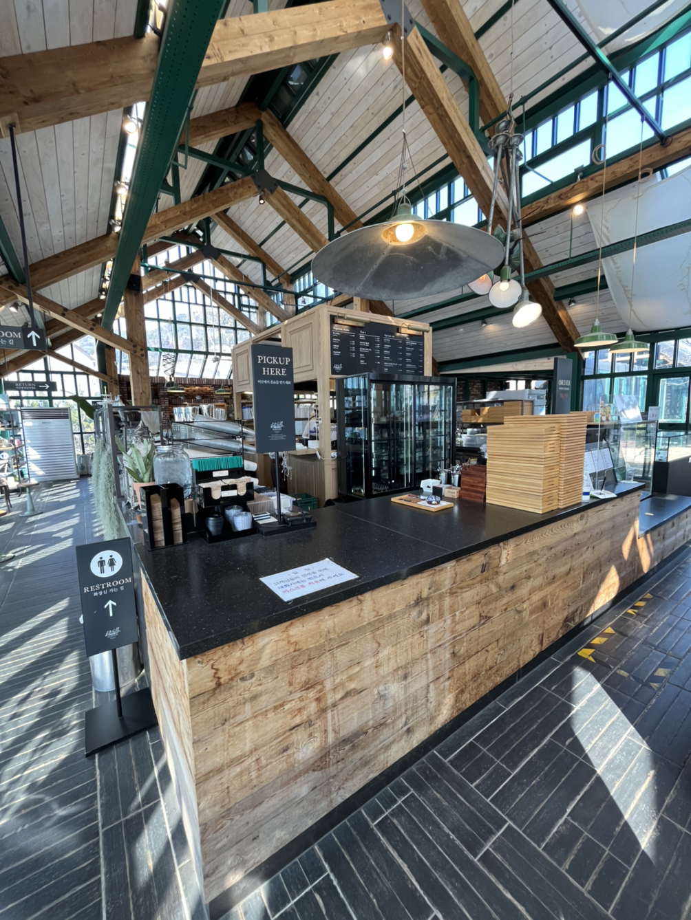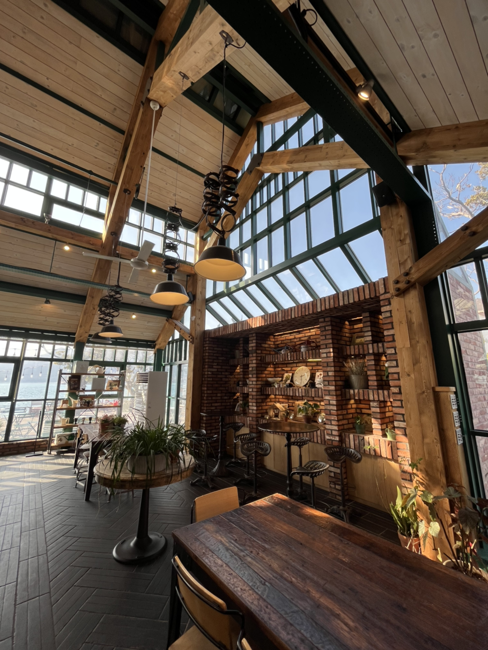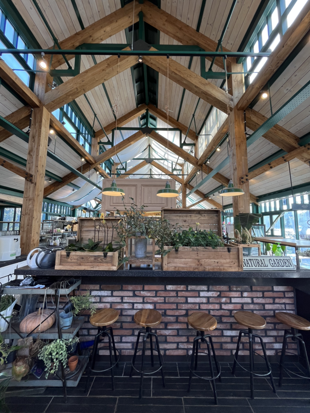 외도 널서리는 나의 취향에 딱 맞는 카페인데 나무 소재로 만들어진 온실에 초록 식물이 가득한 인테리어가 편안하고 따뜻한 공간이다. 삼각형으로 높은 천장에는 하얀 광목천이 햇빛을 가려주고 있고 곳곳에 행잉 플랜트나 화분들이 다채로운 풍경을 만들어 준다. 작은 인테리어 소품들이 아기자기하고 채광이 좋으니 어디서 찍어도 사진이 예쁘게 잘 나온다.
