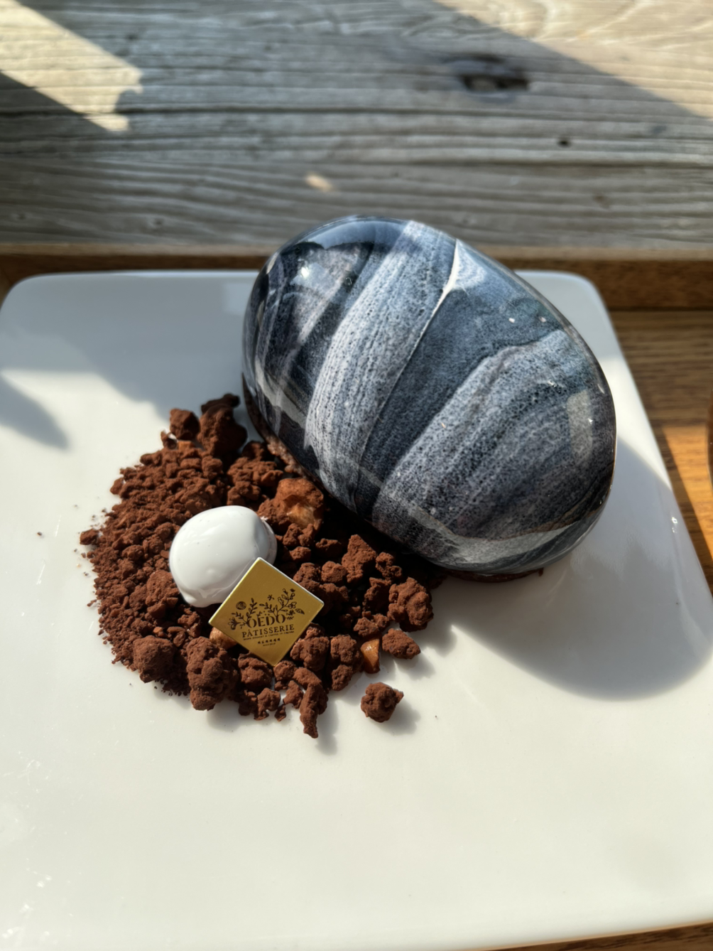이곳의 시그니처 커피는 연유와 생크림을 올리고 거제산 제피를 올린 아이스커피인데 연유 맛이 느껴지는 아인슈페너라고 설명하면 되겠다. 제피 향은 거의 느껴지지 않아서 아쉬웠다. 디저트로는 몽돌을 형상화한 초콜릿 케이크가 있다. 바삭한 쿠키 위에 초콜릿 케이크 시트, 부드러운 가나슈 크림을 화이트 초콜릿 틀 안에 채워 몽돌 색의 마블링을 뿌렸다. 동글동글한 조약돌 모양이 귀엽기도 하지만 과하게 달지 않은 초콜릿의 맛이 풍부하게 느껴진다. 흙처럼 뿌려진 쿠키 크럼블은 카카오 파우더의 맛과 진한 버터향이 강한 편.