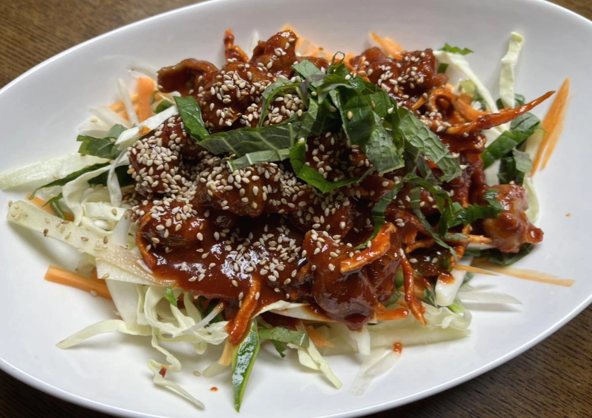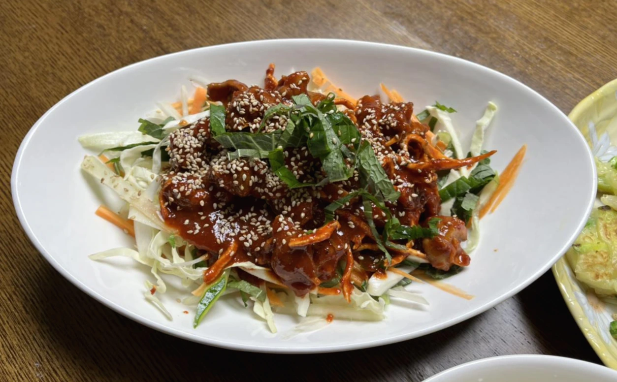 채소는 양배추, 오이, 당근, 깻잎 등을 채 썰어서 준비했어요. 파채만 넣고 골뱅이 무침을 하는 레시피도 있지만 저는 채소가 듬뿍 들어간 게 좋아요. 양념장은 미리 준비해서 북어채를 넣어 두면 좋은데 저 날은 아마 북어가 없어서 진미채를 조금 넣었던 것 같아요. 근데 진미채는... 썩 어울리진 않더라고요.