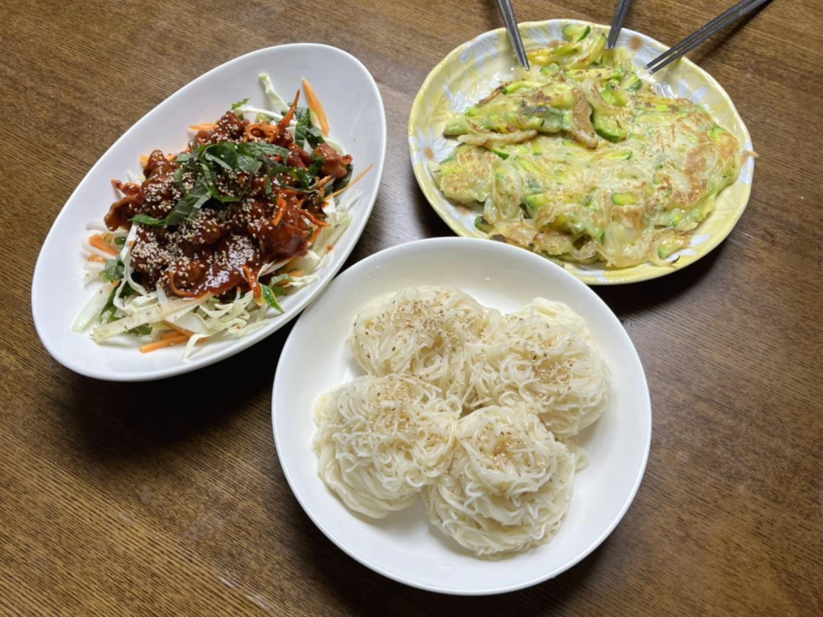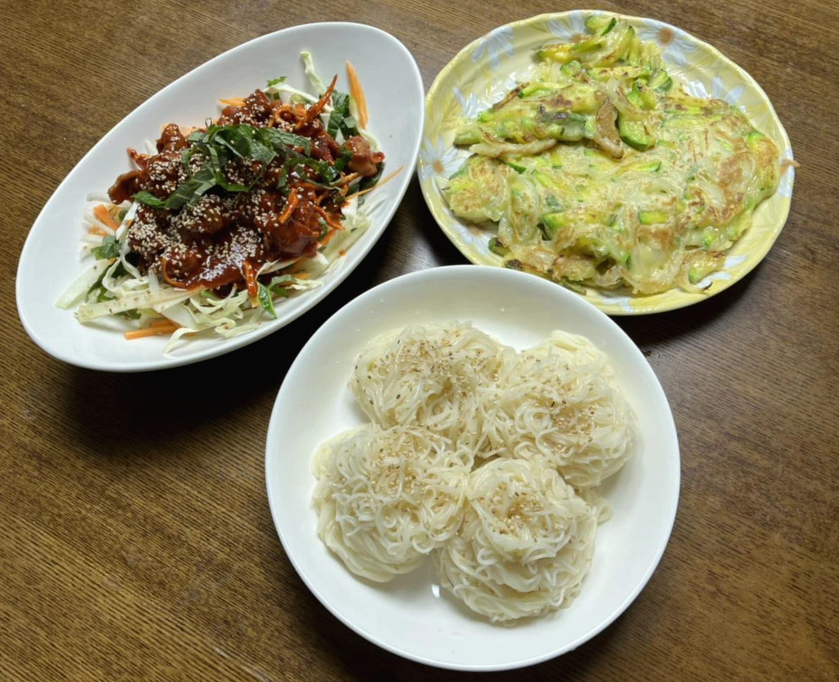 근데 여기서 애호박전을 구우려면 애매해지는 거죠. 전도 미리 부쳐 놓으면 맛이 없단 말이에요? 뜨끈할 때 후후 불어서 먹는 전이 맛있는데 말이죠. 소면과 골뱅이가 완성되자마자 팬에 미리 만들어둔 반죽을 올려 센 불에 부쳐줍니다. 애호박전을 동그랗게 부쳐내면 모양이 참 예쁘지만 하나씩 뒤집을 여유가 없답니다. 그래서 애호박 1개와 양파 반개를 채 썰어서 반죽을 만들었어요. 한판 두툼하게 부쳐주면 달큼한 애호박과 양파의 맛이 아주 좋아요. 앞뒤 후다닥 부쳐서 접시에 올리다 모양이 찌그러졌습니다.