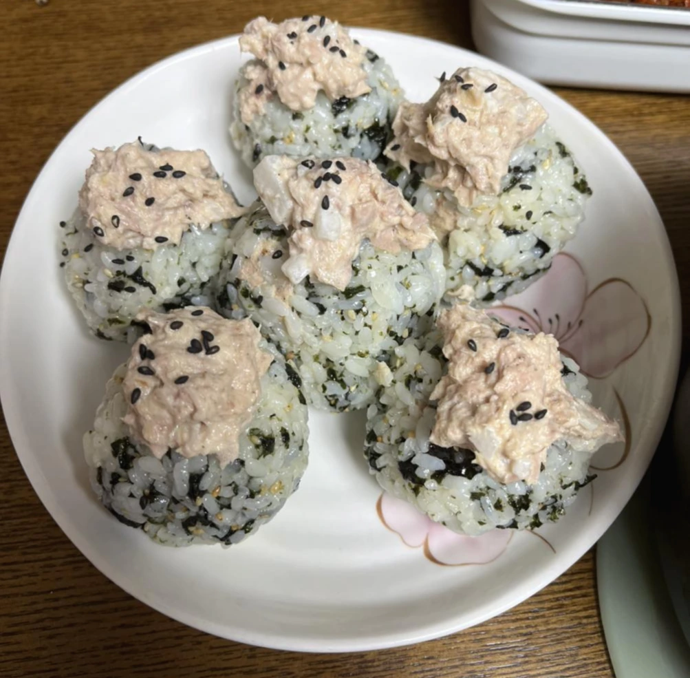 저는 밥 사이에 참치 마요를 넣고 동글동글 모양을 잡은 뒤에 주먹밥 위에 참치 마요와 검은깨를 뿌려 완성해줬어요. 귀찮으면 처음부터 다 섞어서 만들어도 괜찮아요. 마요네즈 양을 조금 줄이면 밥과 섞어도 잘 뭉쳐질 겁니다.