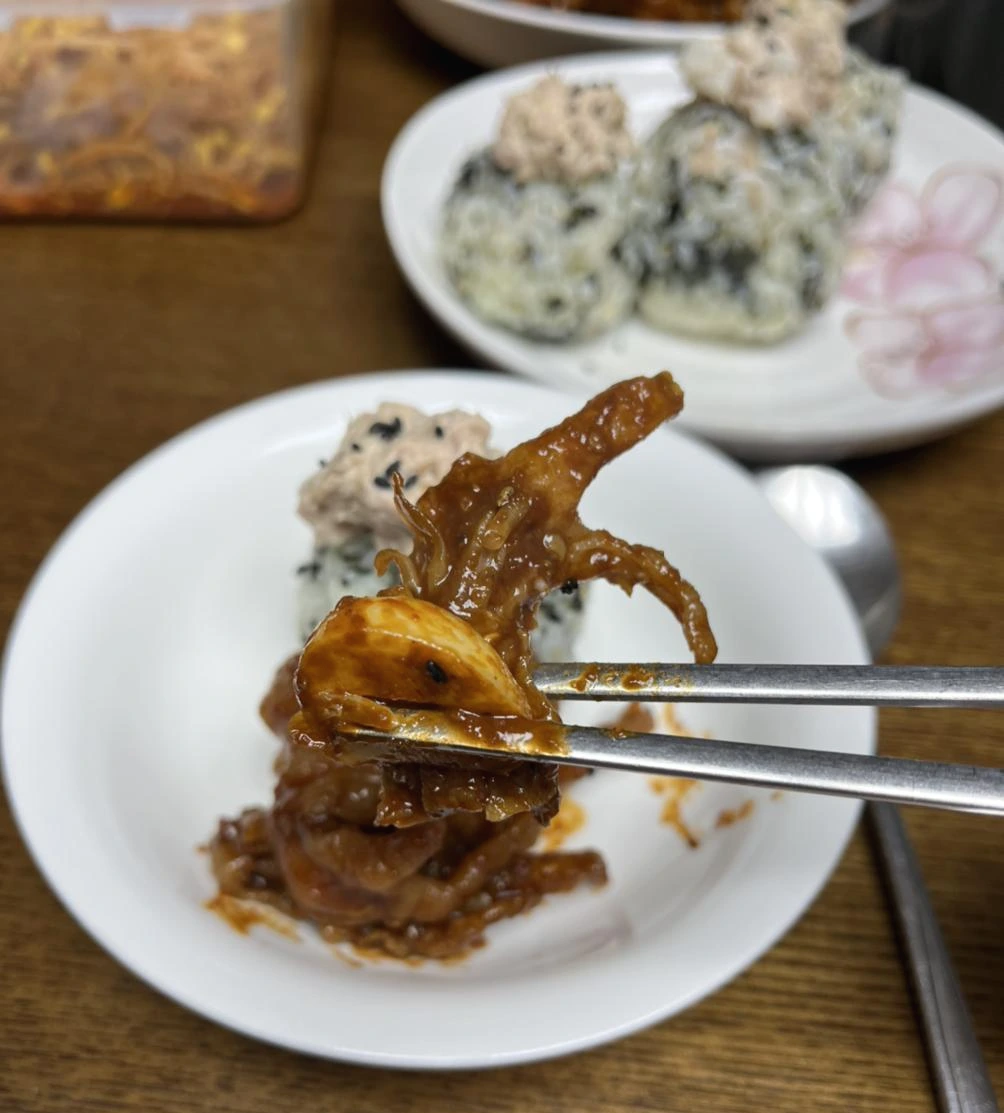 250g짜리 무뼈 닭발 4팩을 주문했는데 진공 소포장으로 아이스팩과 함께 배송받았어요. 4팩을 통마늘과 함께 볶았더니 아래 사진만큼의 양이 되었어요. 통마늘이 없으면 양파나 대파를 같이 넣고 볶아도 좋고 그냥 닭발만 볶아서 먹어도 돼요. 닭발은 이미 조리가 끝난 상태이니 프라이팬에 마늘을 볶다가 거의 다 익을 때쯤 닭발을 넣고 함께 볶아줍니다. 양이 많아서 시간이 좀 걸리는데 타지 않도록 물 한 컵을 부어줬어요. 닭발이 볶아지는 동안 냄비에 계란찜도 하고 주먹밥도 만들어 줍니다.