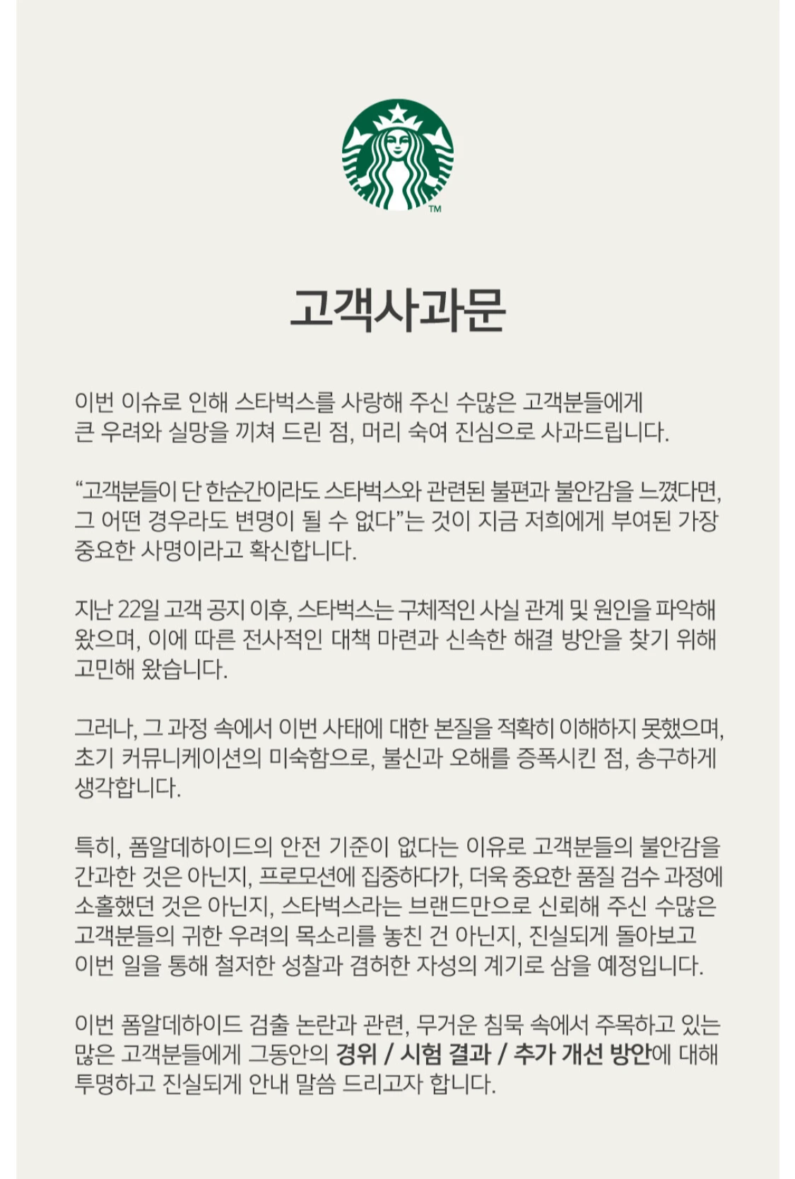 갑작스러운 사태에 파트너들도 많이 당황했고 늘어난 업무량에 버거워하고 있습니다. 매번 고객님들께 상황을 설명하고 사과드리고 있지만 파트너들에게 화를 내는 분들도 더러 있습니다. 같이 일하는 동료들이 힘들어하는 것을 보고 이 글을 쓰기로 했어요. 부디 파트너들에게 화내지 말아 주세요. 스타벅스를 사랑한 만큼 실망감도 클 거라 생각합니다. 충분한 보상이 이뤄지고 품질에서 개선되는지 계속 지켜봐 주세요.