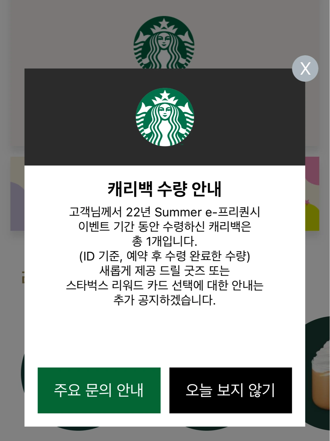 고객님께서 캐리백을 예약하고 수령했던 내역을 토대로 개별 안내될 예정입니다. 스타벅스 어플에 다음과 같은 안내문을 보실 수 있습니다.