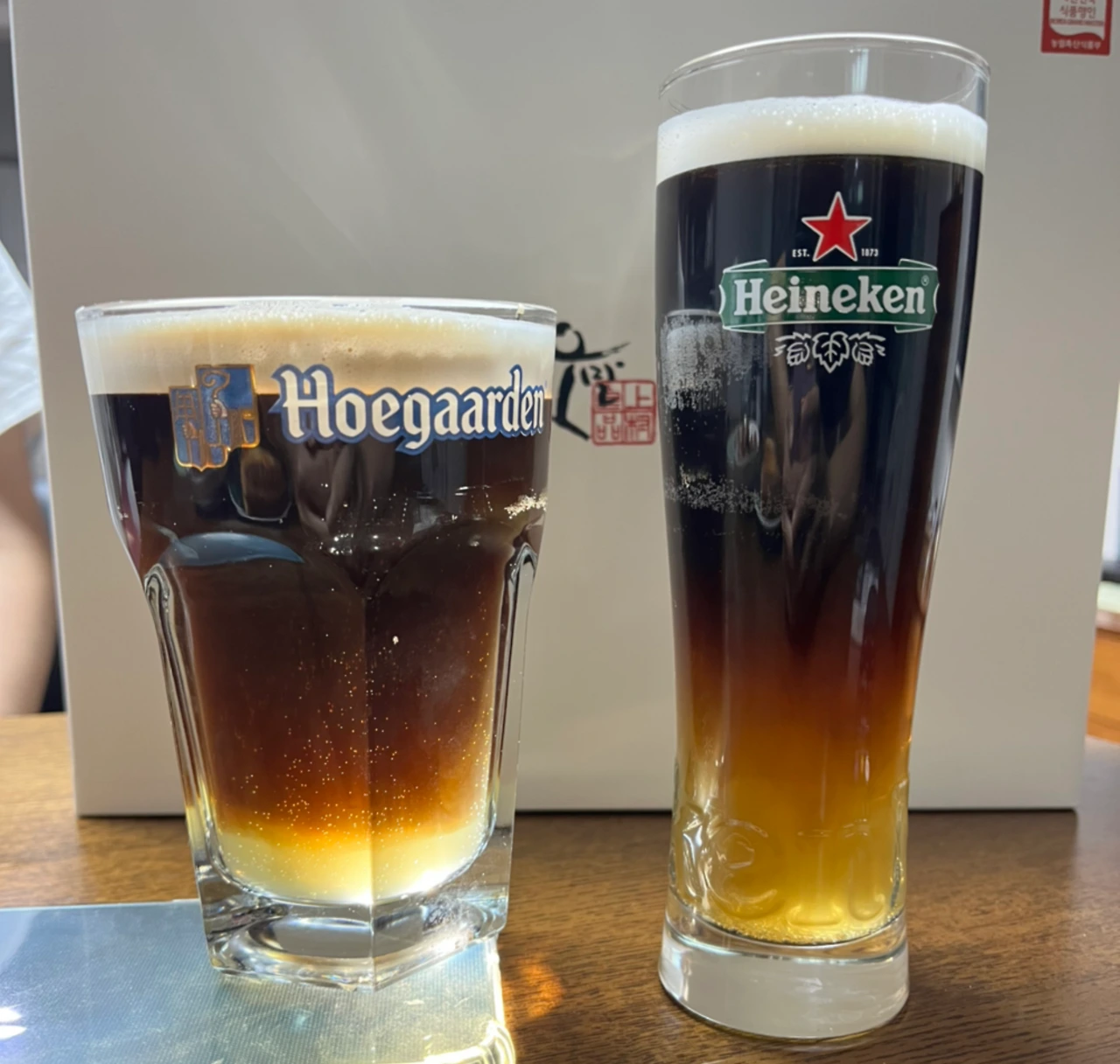 맥주잔에 호가든을 절반쯤 따르고 그 위에 숟가락을 대고 천천히 기네스를 흘려주면 이렇게 층분리가 된 맥주 칵테일을 만들 수 있습니다. 블랙앤탠(Black&Tan)이라고 부르기도 하고 더티호(Dirty Hoe)라고 부르기도 합니다. 흑맥주인 기네스의 쌉쌀한 맛을 호가든의 산뜻한 맛과 중화시켜 좀 더 편안하게 즐길 수 있게 됩니다. 저는 코젤 다크나 기네스 같은 흑맥주를 좋아해서 이런 맥주 칵테일도 매력 있었어요. 잔 바닥에 핸드폰 플래시를 받쳐두면 좀 더 그럴싸해 보입니다.