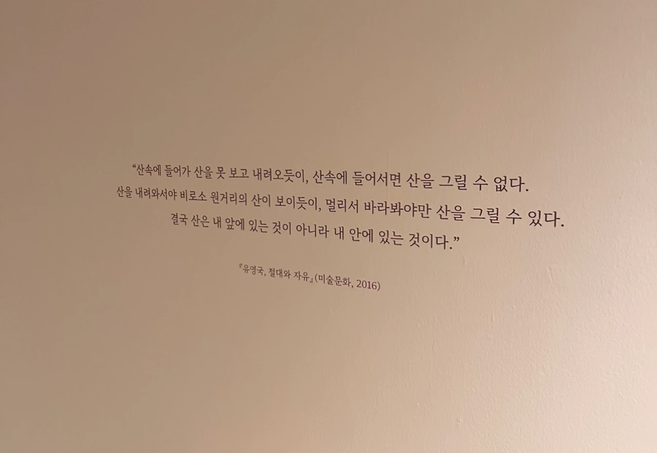 "산속에 들어가 산을 못 보고 내려오듯이, 산속에 들어서면 산을 그릴 수 없다. 산을 내려와서야 비로소 원거리의 산이 보이듯이, 멀리서 바라봐야만 산을 그릴 수 있다. 결국 산은 내 앞에 있는 것이 아니라 내 안에 있는 것이다."-『유영국, 절대와 자유』(미술문화, 2016)