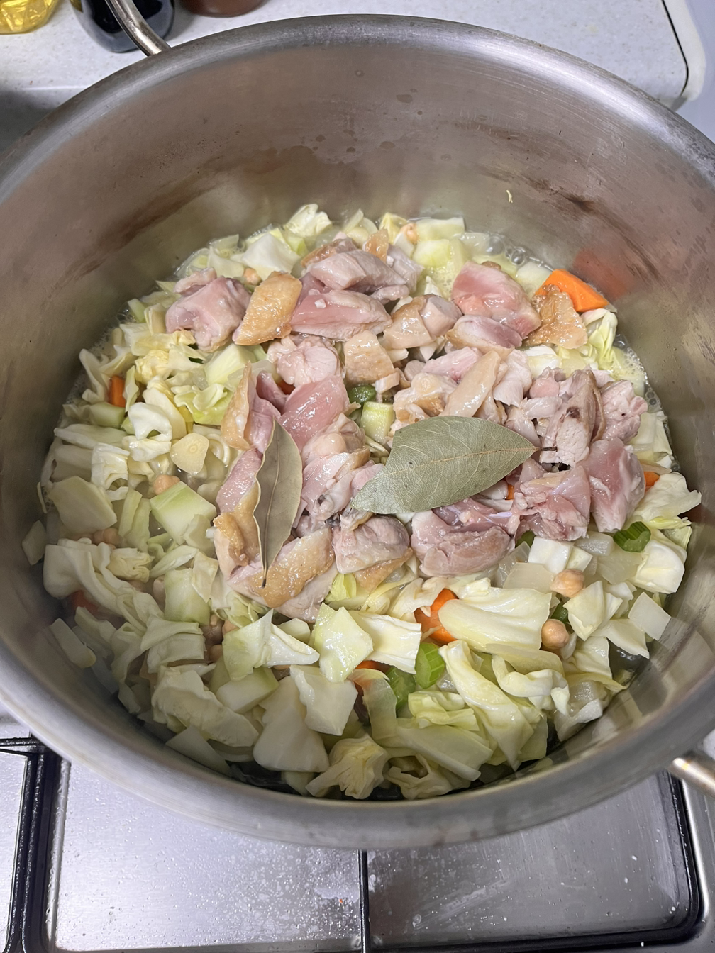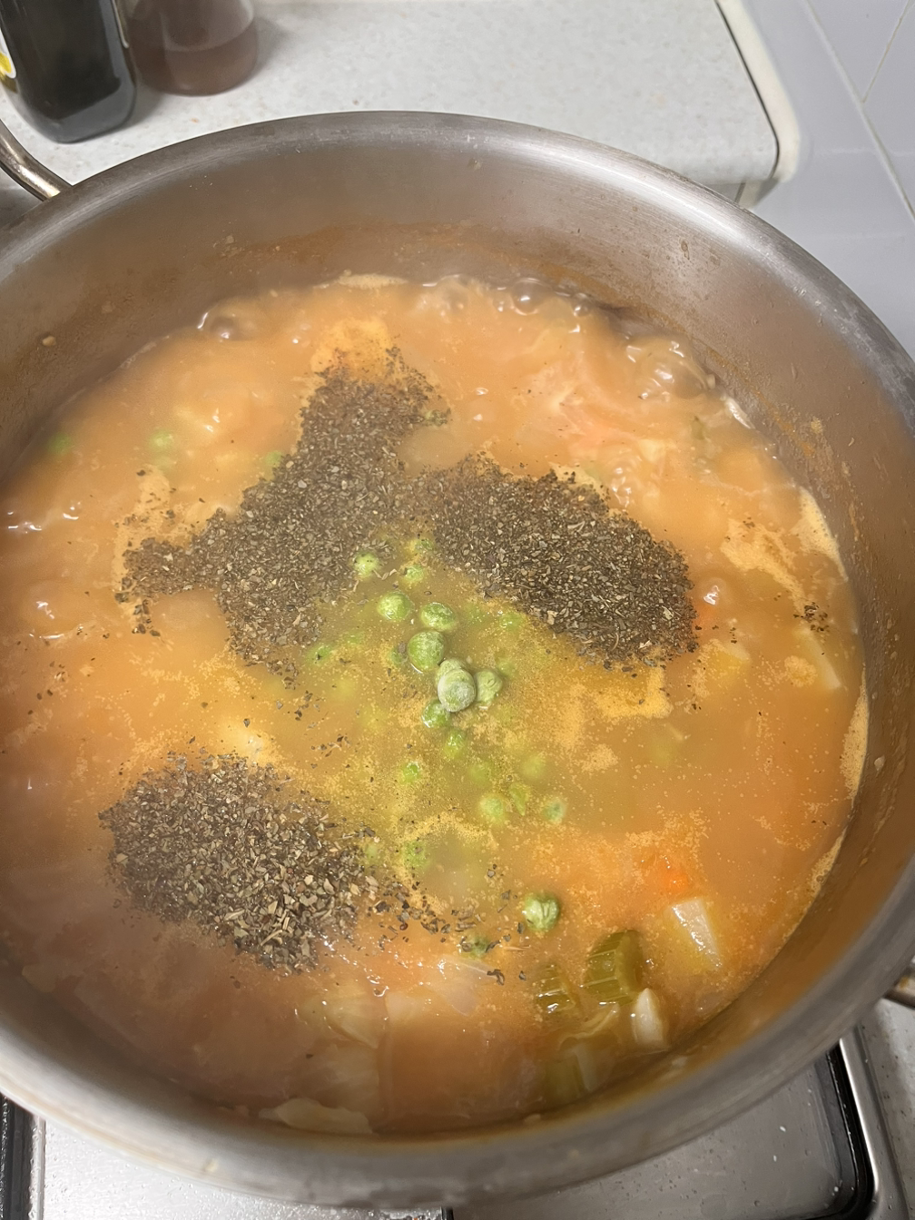 냄비에 물 500~600ml를 넣고 볶은 채소들과 닭고기, 양배추, 불린 병아리콩, 깍둑썰기한 브로콜리 대를 넣고 끓여줍니다. 처음에는 물이 적어 보이지만 채소에서 물이 많이 나온답니다. 한소끔 끓으면 갈아놓은 토마토 과육을 넣고 소금 간을 더합니다. 월계수 잎을 1~2장 넣고 바질 가루를 1 작은술 넣어줍니다. 이제 약불에 뭉근하게 끓여주다가 마지막에 냉동 완두콩을 넣고 5분 정도 끓여주면 끝입니다. 저는 남겨놓은 브로콜리 송이 몇 개를 완두콩과 함께 넣어주었어요.