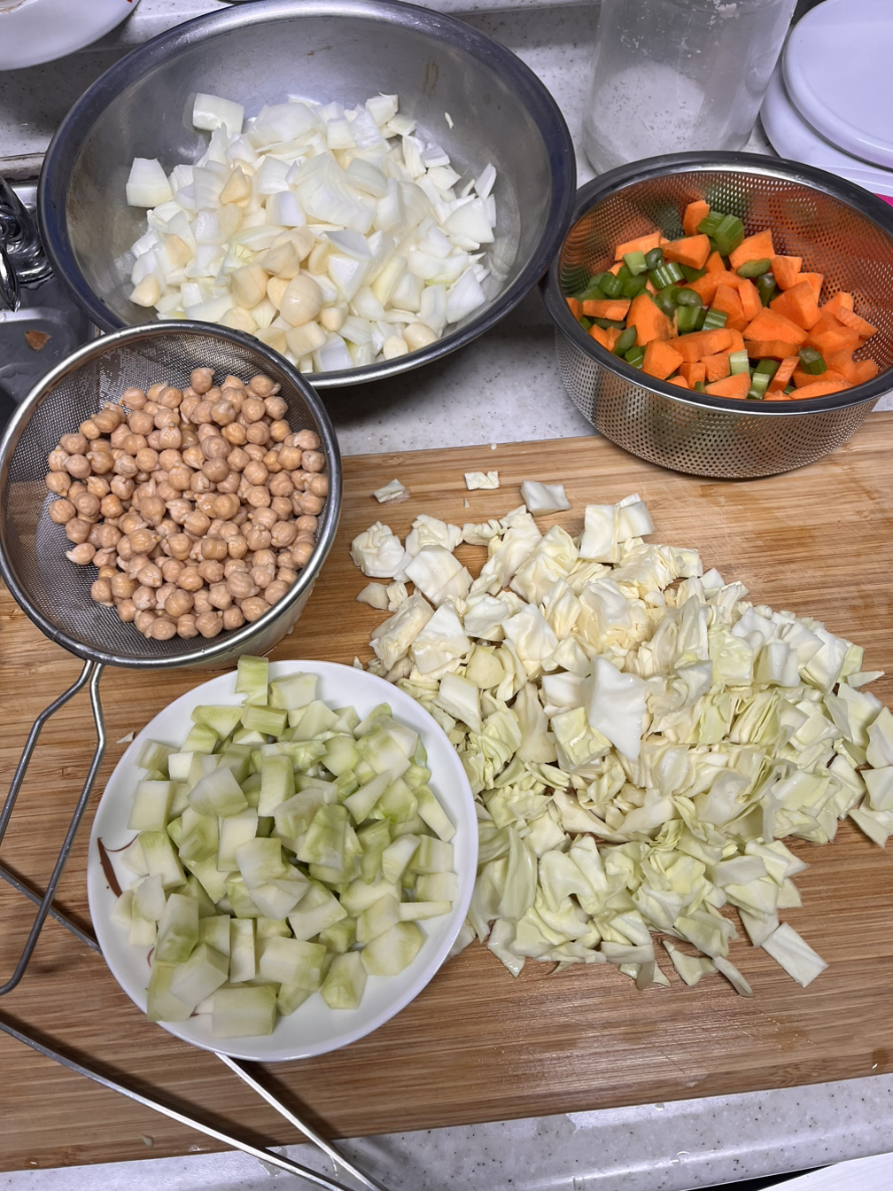양배추는 끓이면서 부피가 많이 줄어드니까 양파보다 조금 더 크게 잘라주세요. 남은 양배추는 채 썰어서 샐러드도 만들어 먹고, 오트밀 죽이나 찐 양배추로 먹어도 맛있습니다.
