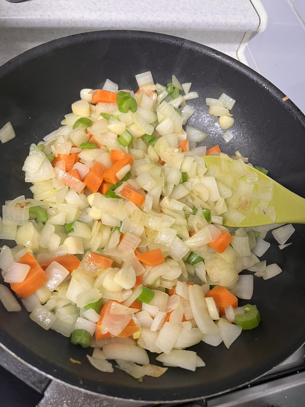 마늘, 양파, 셀러리, 당근은 먼저 볶아서 수프를 끓일 거예요. 이 채소들은 향이 강하다는 특징이 있죠? 수프의 기본은 양파와 셀러리, 당근을 볶아서 풍부한 향과 단맛을 내주는 것입니다. 마늘과 양파를 먼저 볶고 양파가 투명해질 즈음 셀러리와 당근을 넣어 볶아주세요. 소금을 반스푼 정도 넣어서 볶아주면 수분이 빨리 날아가고 단맛이 극대화됩니다.