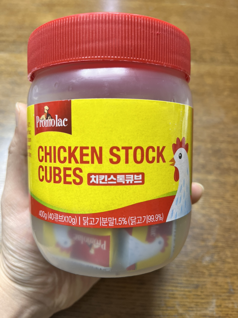 시판 치킨스톡의 영양성분을 보면 설탕이 함유되어 있고 닭고기 비율은 많이 적어요. 원재료 표시는 가장 많이 들어간 재료부터 표기하는데 첫 번째가 정제소금이고 두 번째가 L-글루탐산 나트륨, 즉 MSG입니다. MSG가 안전한 조미료라는 연구결과가 많지만, 저에게는 늘 너무 자극적으로 느껴져요. 그래서 닭다리살로 닭육수의 풍미를 살리고 완두콩과 병아리콩을 더해 단백질 섭취를 늘렸어요.