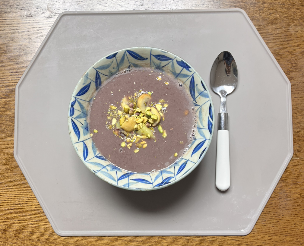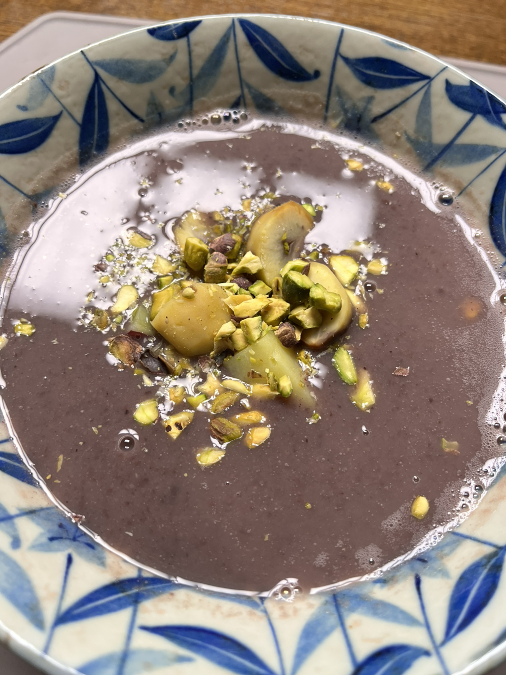 보통 팥죽을 끓이면 여기에 쌀가루나 찹쌀을 넣고 동그랗게 빚은 새알심까지 넣어주겠죠? 맛이야 좋겠지만 탄수화물 섭취가 너무 많아지는 게 문제랍니다. 그래서 곱게 간 팥을 한번 끓여 죽처럼 먹고 밤과 고구마를 고명으로 조금 올려주었어요. 여기에 피스타치오를 다져 장식했습니다. 피스타치오에는 멜라토닌이 많아 숙면에 도움이 된다고 해요. 멜라토닌은 취침 시간이 되면 몸이 긴장을 풀고 이완시켜 주는 호르몬입니다.