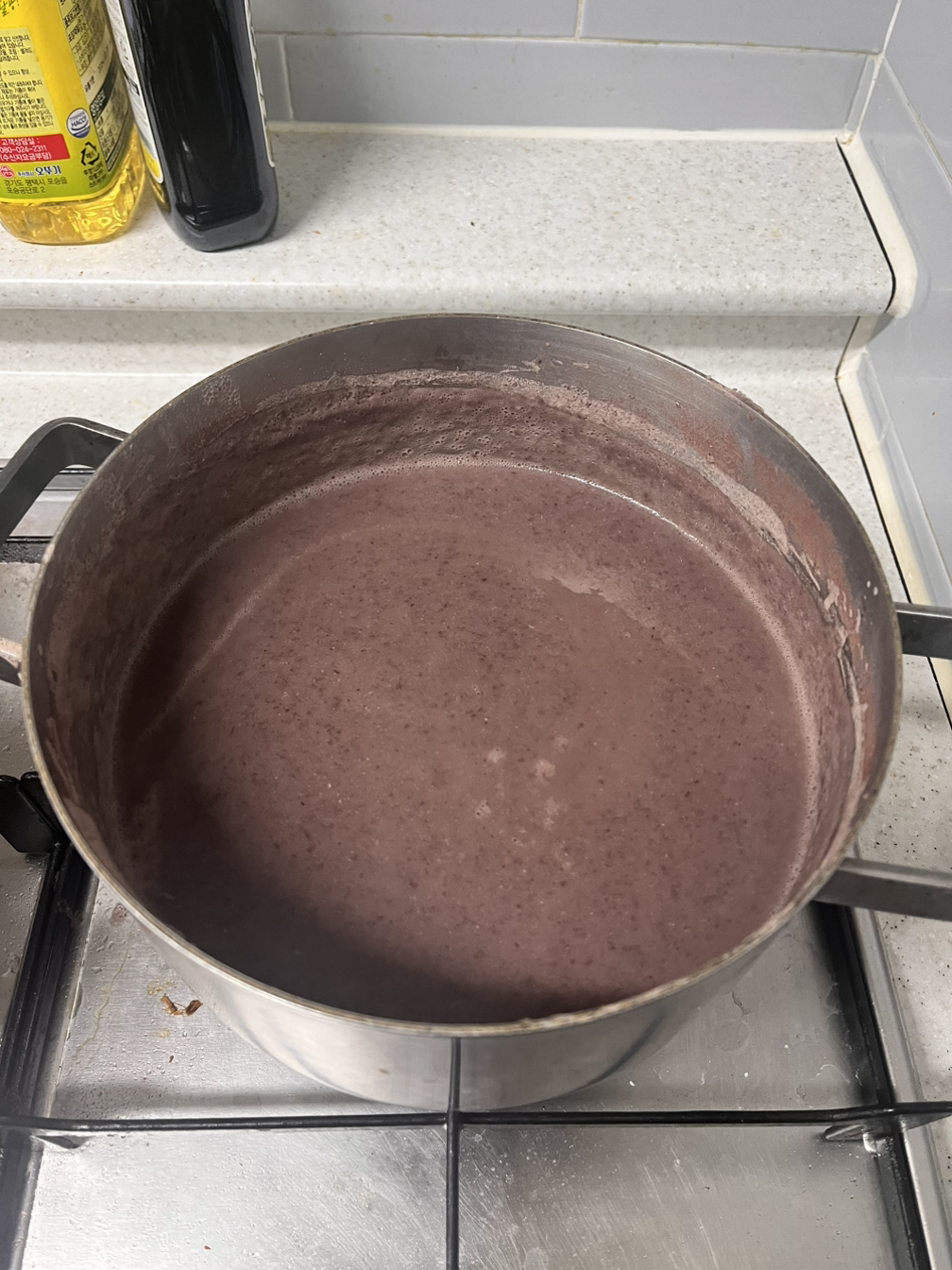 남은 팥에 새로 물을 받고 팥이 부드러워질 때까지 삶아주세요. 소금을 넣고 20분 정도 삶아주었는데 각 가정마다 화력이 다를 테니 팥알을 직접 먹어보거나 손으로 으깨보는 것이 정확할 겁니다. 팥을 눌러보아 부드럽게 뭉그러지면 잘 익은 거예요. 한 김 식힌 후에 블렌더에 곱게 갈아주세요. 이 상태로 냉장 보관 하시다가 데워서 먹으면 편해요. 묽기는 여러분의 취향에 맞추시면 됩니다.