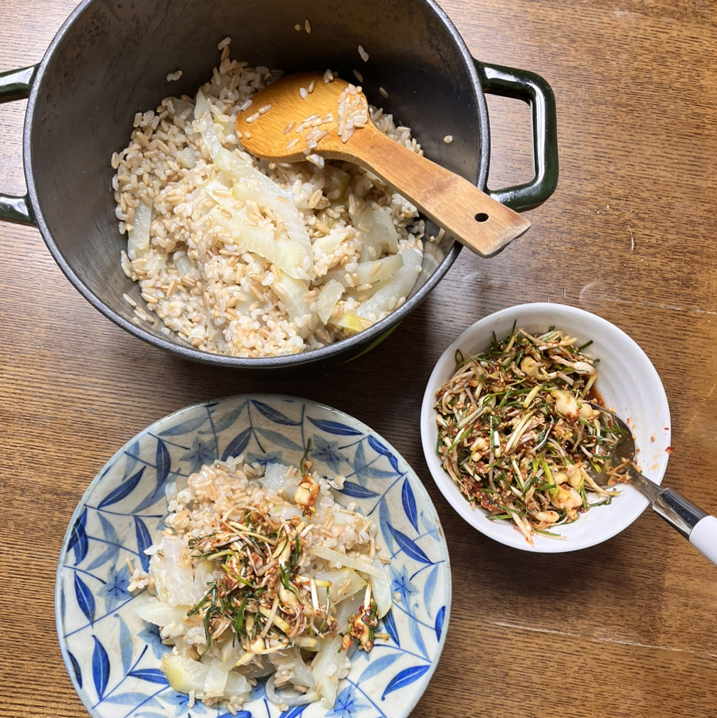 시골 할머니는 흰쌀 위에 채 썬 무를 넣고 밥을 하셨어요. 저는 현미랑 귀리로 밥을 할 거라 냄비에 불을 올려 한소끔 끓여줍니다. 약불로 불을 낮출 때쯤에 채 썬 무를 올려주세요. 오랜만에 꺼낸 무쇠냄비가 맛있는 밥을 완성해 줄 겁니다. 그 사이 달래를 꺼내 쫑쫑 썰어주세요. 멸치간장에 다진 파, 다진 마늘, 달래, 통깨에 참기름 듬뿍 넣고 고춧가루도 조금 넣어줍니다. 레시피랄게 없죠. 이게 다 할머니 손맛입니다.
