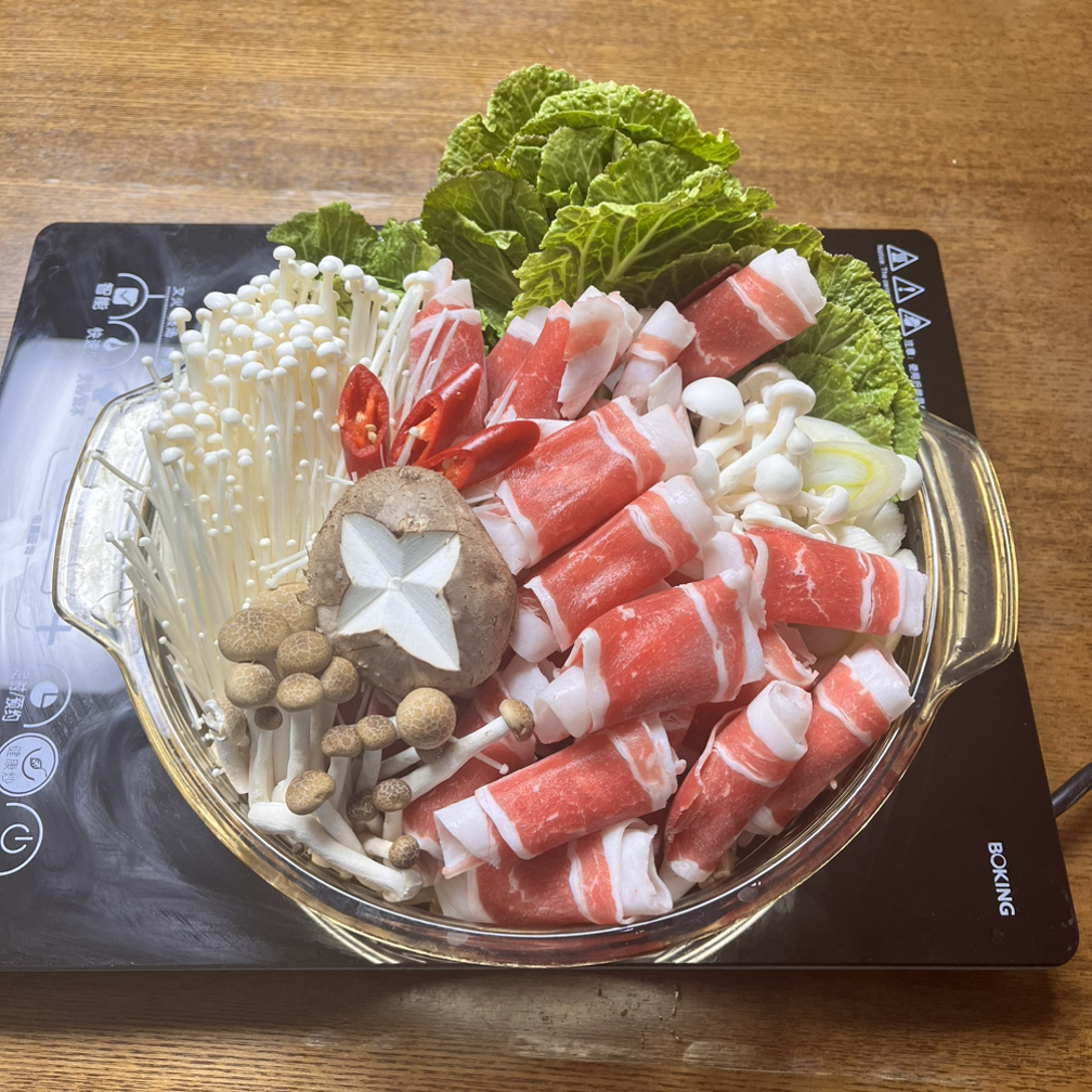 준비해 둔 냄비에 붓고 잘 끓이기만 하면 돼요. 식탁에 올려두고 끓이면서 원하는 만큼 재료를 추가해서 드셔도 좋아요. 저는 냉동 차돌박이 200g 담아주었어요. 차돌박이는 샤부샤부용 고기보다 기름기가 많아서 된장 육수에 깊은 맛을 더해줍니다. 오랜만에 꺼낸 유리 냄비에 예쁘게 세팅해 놓고 사진을 찍었어요. 근데 인덕션에선 유리 냄비를 사용 못하더라고요. 사진빨 잘 받으라고 홍고추도 썰어서 예쁘게 장식해 줬는데 말이죠. 다시 스테인리스 냄비에 옮겨서 육수 붓고 끓여 먹었답니다.
