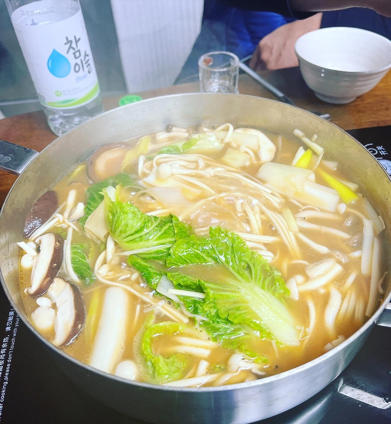 고기와 채소를 충분히 먹은 다음에는 칼국수 면사리를 넣고 끓여 먹어도 좋아요. 버섯과 대파, 봄동을 추가로 넣고 물을 보충해서 칼국수를 끓였습니다. 저희 아버지는 칼국수에 소주도 반 병 곁들여 드셨는데요. 저는 요즘 식단을 하니 국수도 소주도 못 먹었지만, 틀림없이 잘 어울릴 맛이네요. 뜨끈한 전골 국물에 소주 한잔. 캬- 상상만 해도 좋죠?