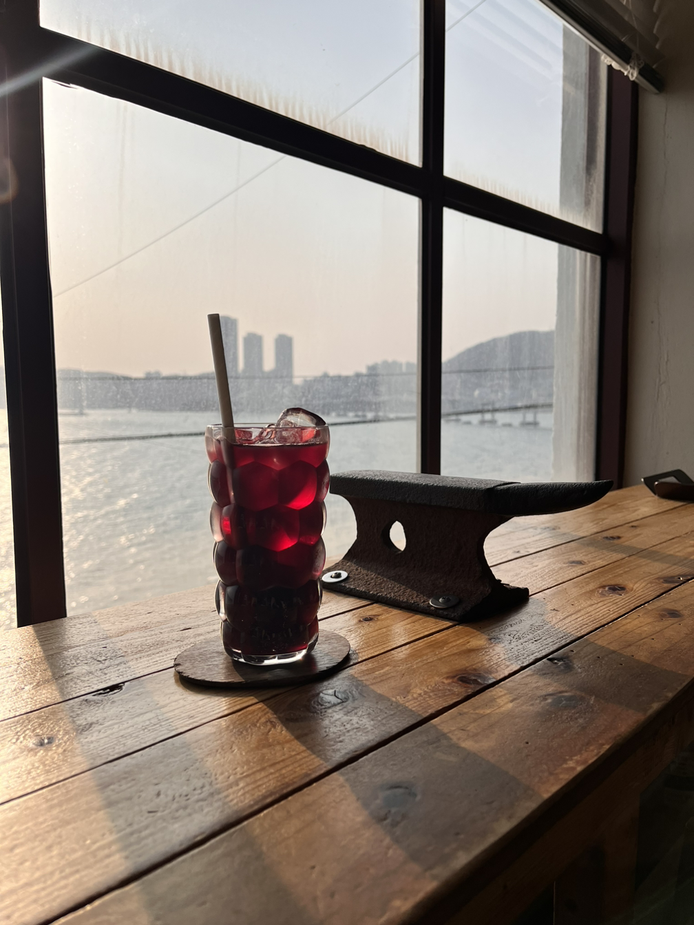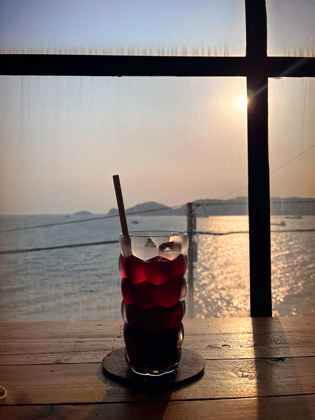 흰여울 마을의 계단을 오르느라 땀이 흥건했기 때문에 글뤼바인과 에이드를 섞은 바인에이드를 주문했습니다. 쌉싸름한 와인과 시원한 탄산이 청량하여 땀을 식혀줍니다. 마침 석양이 지고 있어서 햇빛이 파도에 부서진 조각들이 붉게 빛납니다. 와인의 색과 잘 어울리네요.