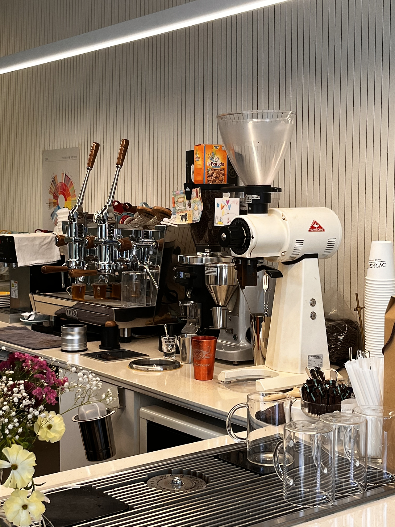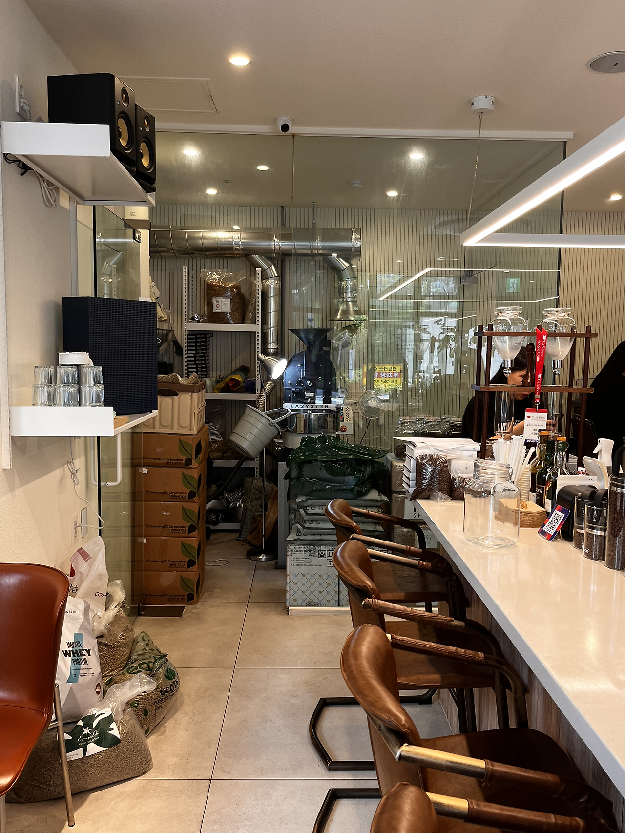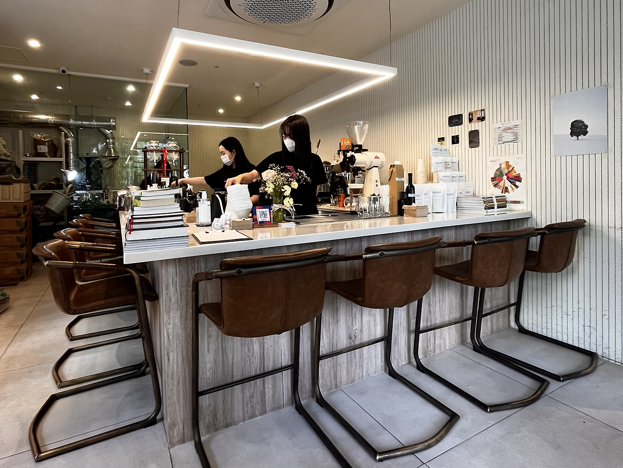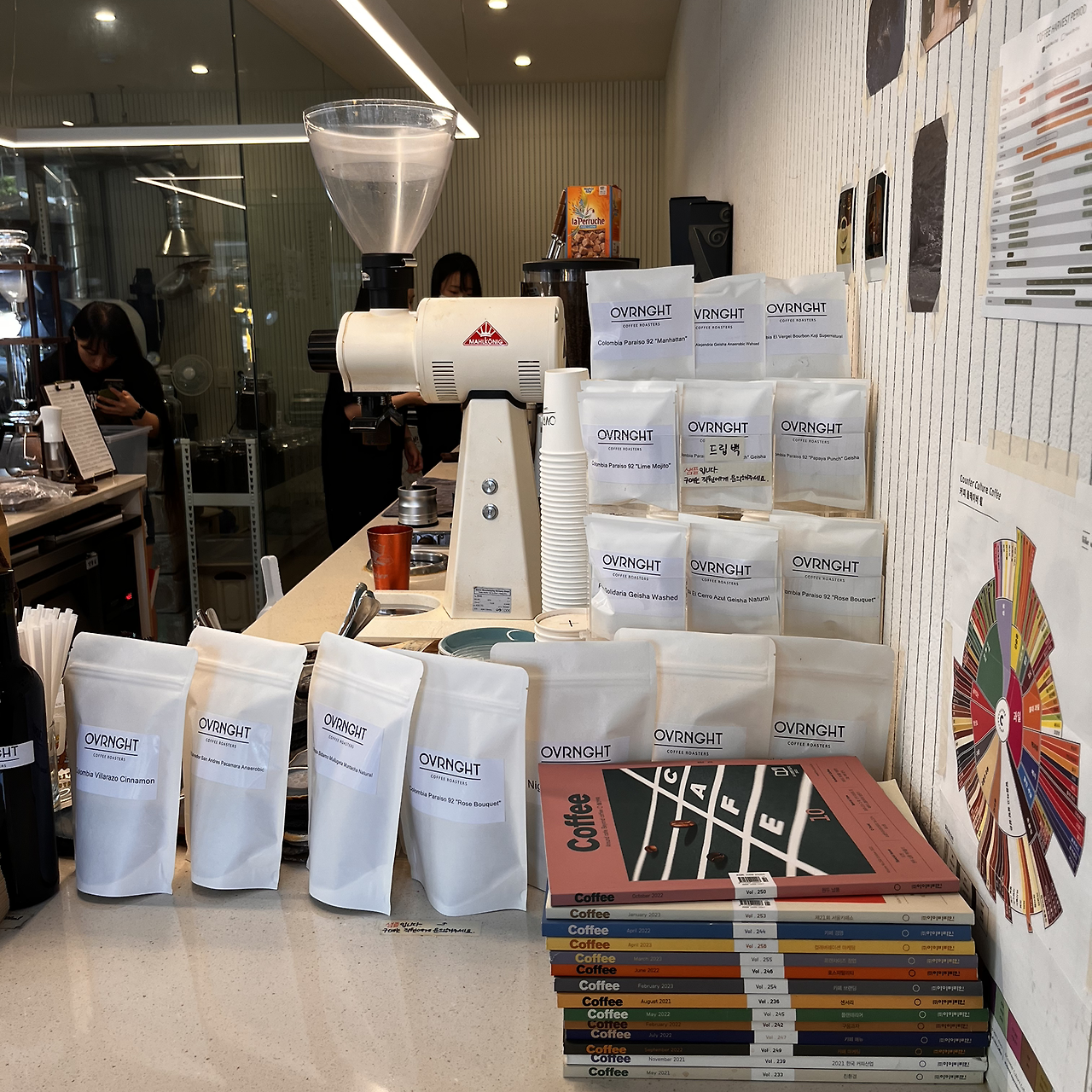 들어가자마자 커피 잡지와 원두 포장들이 보입니다. 하얀색 그라인더는 말코닉 EK43입니다. 300~400만 원 대에 소음이 적고 균일하게 분쇄된다는 장점이 있어요. 입구 쪽 바에 브루잉 스테이션이 있어서 커피를 내리를 모습을 볼 수 있습니다. 바에 앉으면 직원들이 커피를 내리면서 친절하게 설명도 해줍니다.