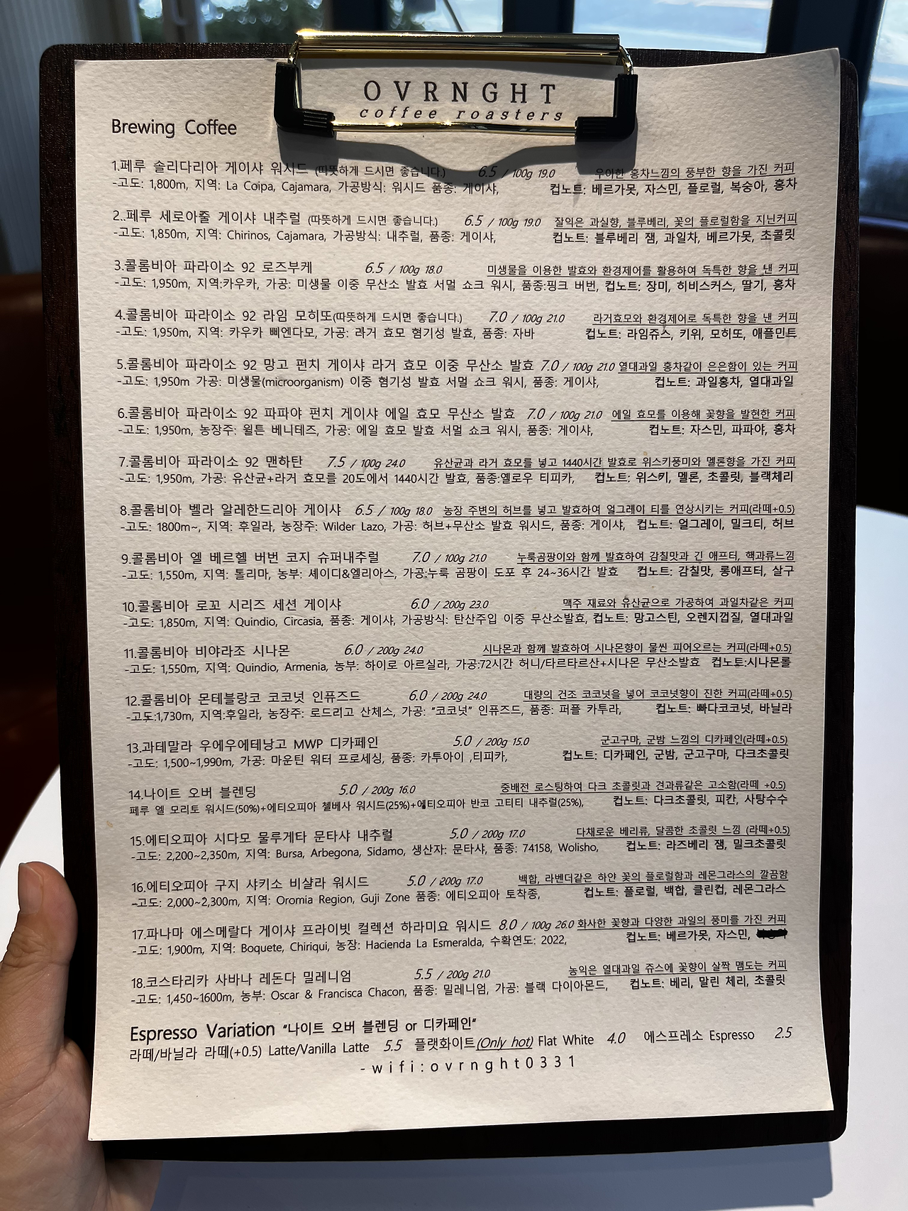 일단 메뉴판을 받고 당황하지 마시고요. (저는 당황했습니다…) 원두 이름이 너무 기니까 번호로 주문하시면 됩니다. (라떼 +0.5)는 500원 추가하면 라떼로 드실 수 있는 원두라는 뜻이고요. 일반적인 에스프레소 메뉴는 아래쪽에 있습니다. 라떼, 바닐라 라떼, 우유가 적은 플랫화이트, 에스프레소가 있네요.