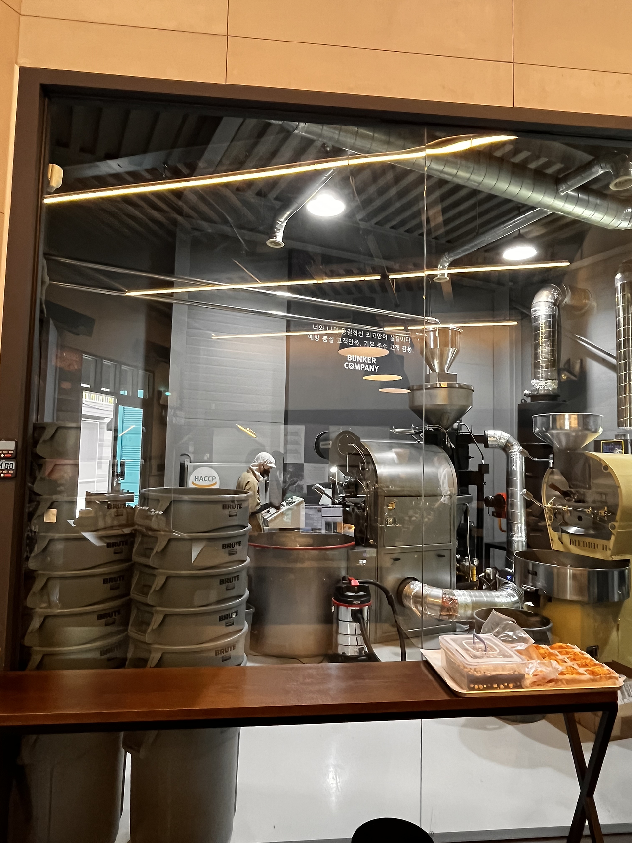 벙커컴퍼니 하남은 로스팅 공장입니다. HACCAP인증을 받은 진짜 공장이요. 보호복과 마스크를 착용한 직원들이 일하는 모습이 보입니다. 로스팅 과정에는 연기나 먼지가 많이 발생하기 때문에 직원의 안전과 위생을 위해 이런 보호복을 준비한 것 같습니다. 여기를 카페라고 생각했던 분들은 꽤 당황스러울 수 있겠어요. 입구에 들어서자마자 생두가 쌓여있는 것이 보이고 유리창 뒤로 거대한 로스팅 기계가 돌아가는 것이 보이네요.