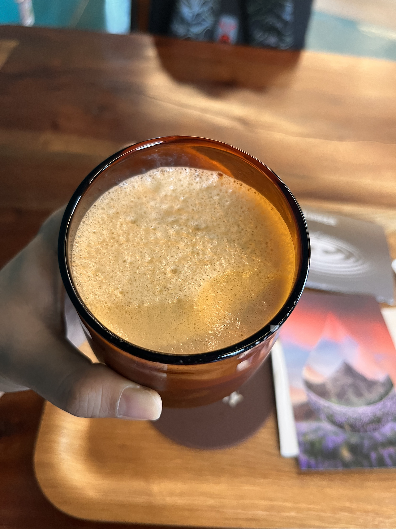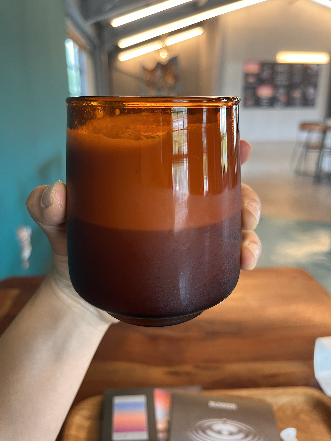 이렇게 추출한 농축된 브루잉 커피를 얼음과 함께 갈아서 얼음잔에 세팅해 줍니다. 그럼 커피와 얼음이 갈리면서 거품이 풍성한 아이스커피가 되는 거예요. 얼음과 에스프레소를 함께 쉐이킹 해서 만드는 샤케라또와도 다른 질감입니다. 커피 거품이 거의 카푸치노의 우유거품처럼 느껴졌어요. 풍성하고 부드러운 거품의 질감을 충분히 즐기고 나면 긴 여운의 향이 남습니다. 딸기 같은 과일과 화사한 꽃향기 같은 뉘앙스에 초콜릿의 단맛이 느껴집니다. 쓴 맛은 하나도 없어서 아이스로 마셔도 부드럽게 느껴져요.