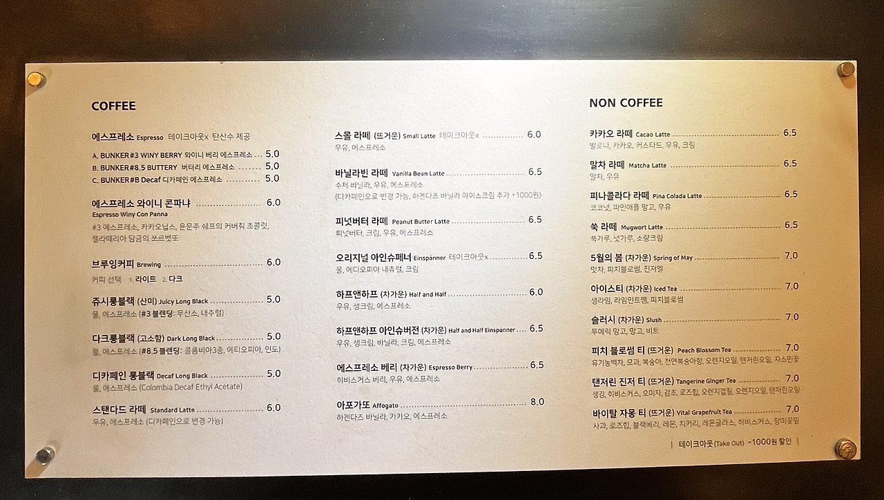 벙커컴퍼니라는 브랜드의 대표는 박승규 바리스타입니다. 개인 유튜브 채널 운영도 하고 제가 구독한 여러 커피 관련 채널들에 자주 등장하셨던 터라 이곳에는 어떤 커피를 파는가 궁금했었어요. 확실히 요즘에는 유튜브, 틱톡, 인스타그램 등 다양한 채널로 브랜드를 자주 노출 시키는 것이 중요한 것 같아요.