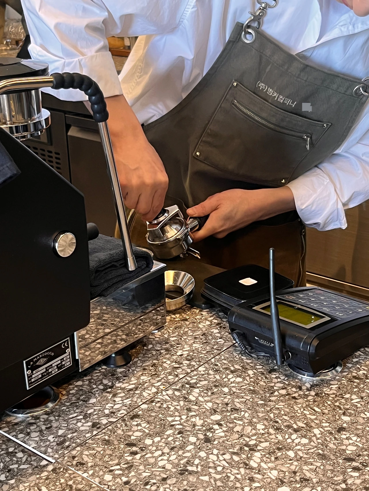 일단 브루잉 방식이야 워낙 다양한 추출 도구가 있지만, 일반적으로는 종이필터를 이용한 중력 방식입니다. 별다른 압력을 가하지 않고 물이 중력에 의해 아래로 흐르는 힘을 이용한 방식이라는 뜻이죠. 종이필터를 끼운 드리퍼에 원두가루를 담고 주전자로 물을 조르륵 부어주는 방식이죠. 그런데 벙커컴퍼니는 에스프레소 머신을 이용한 브루잉 방식을 씁니다. 라마르조꼬에서 출시한 브루잉 머신은 에스프레소 같은 포터필터에 원두를 담고 3 bar의 압력을 하게 추출합니다. 에스프레소보단 적은 압력이지만 일반적인 중력방식 보단 좀 더 압력이 가해지고 종이 필터가 없으니 원두의 지방 성분이 그대로 추출될 겁니다. 집에서 머신 없이 비슷하게 따라 하려면 에어로프레스를 이용해 추출하면 비슷할 것 같아요.