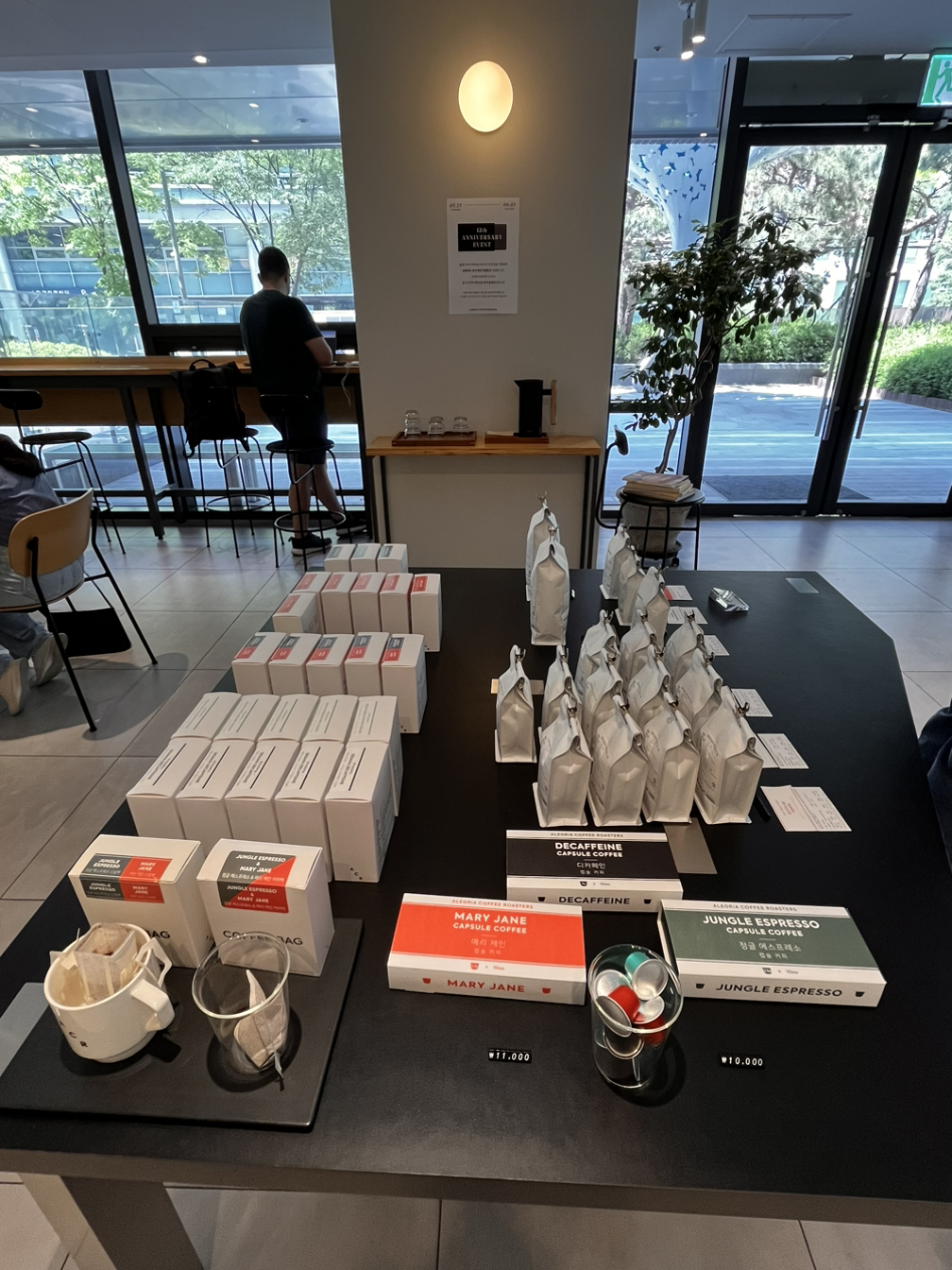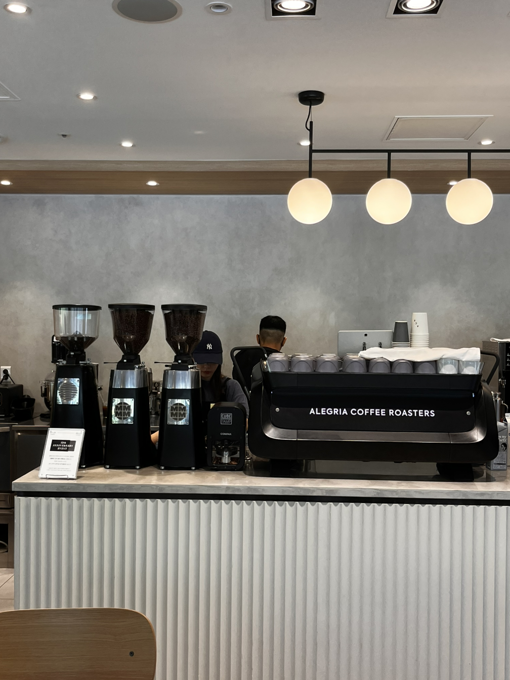 인테리어는 알레그리아만의 특징이 있다고 보기 힘들 것 같습니다. 집기류나 에스프레소 머신에 검은색이 많다는 것 외에 특정 색상이 도드라지거나 캐릭터, 로고가 한눈에 들어오진 않았어요. 유리를 많이 사용해서 개방감이 느껴지고 모노톤의 인테리어가 깔끔한 인상을 주긴 했습니다. 다른 지점에 가면 또 다른 느낌을 받을 수 있겠죠.