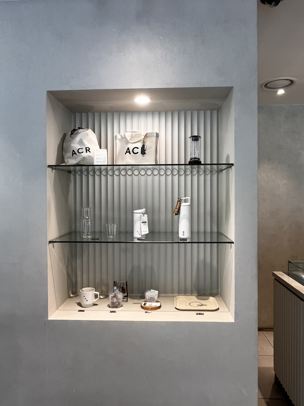 규모가 많이 크지 않고 점심시간에는 웨이팅이 있을 정도로 사람이 많은 편입니다. 입구로 들어가면 원두 매대와 굿즈 진열장이 보이고 안쪽에 바가 있습니다. 건물화장실을 사용하는데 카페와 가깝지는 않아요. 건물 내로 한참 걸어가야 합니다.