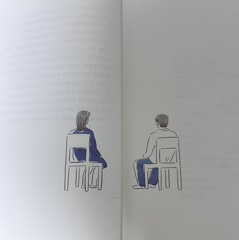 책을 펼치면 17페이지에 아내가 남긴 유언 같은 문장이 있습니다. 그다음 페이지에는 담백한 삽화가 하나 나와요. 나란히 앉아 같은 곳을 바라보는 부부의 뒷모습을 그렸는데, 아내는 왼쪽 페이지에 남편은 오른쪽 페이지에 그려져 있어요. 여백이 많은 책 한 바닥의 그림을 보다가 눈물이 차오릅니다. 책을 묶어 놓아 생긴 그림자가 이승과 저승의 경계 같이 느껴져서요.
