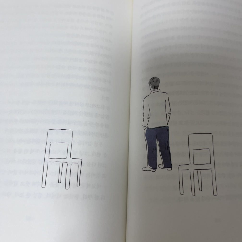 오래 고아낸 곰탕 국물을 후루룩 들이켜듯 책을 읽었습니다. 204 페이지쯤 되었을 때 다시 삽화가 나왔어요. 아내가 있던 자리는 빈 의자만 남았고 남편은 주머니에 손을 꽂은 채 서있는 뒷모습. 말로 다 할 수 없는 슬픔을 그림으로 전해서 감정이 흔들립니다.