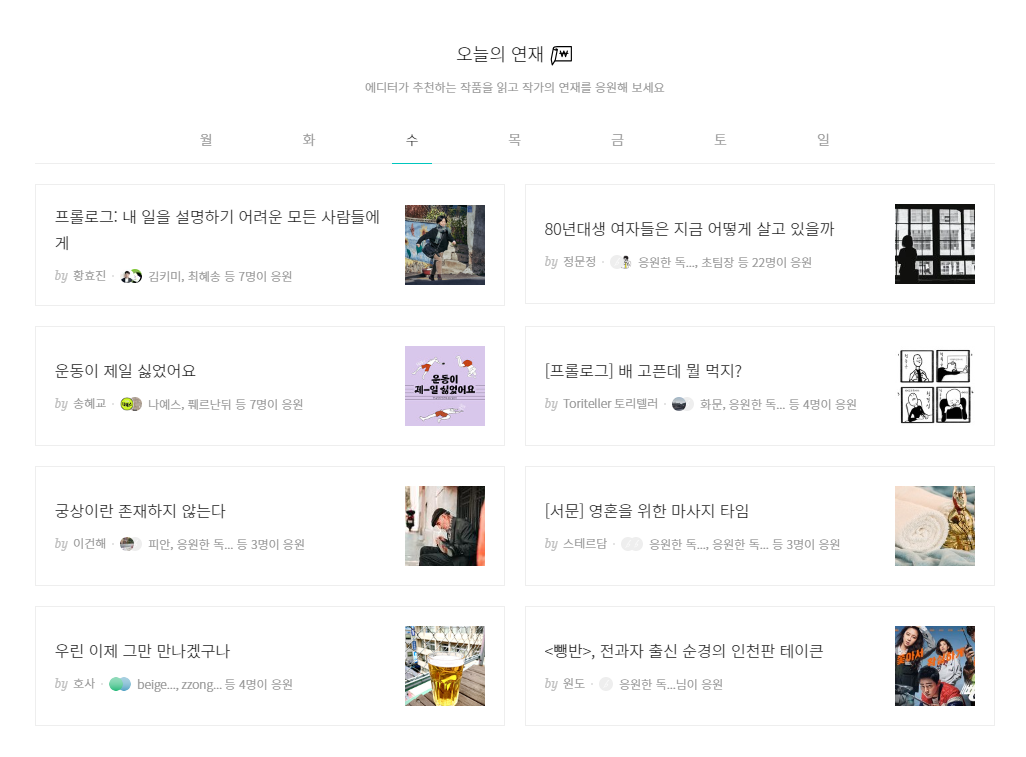 지난 수요일의 '오늘의 연재' 보드입니다. 보기만 해도 네이버와 결이 다르다는 게 느껴지죠?
