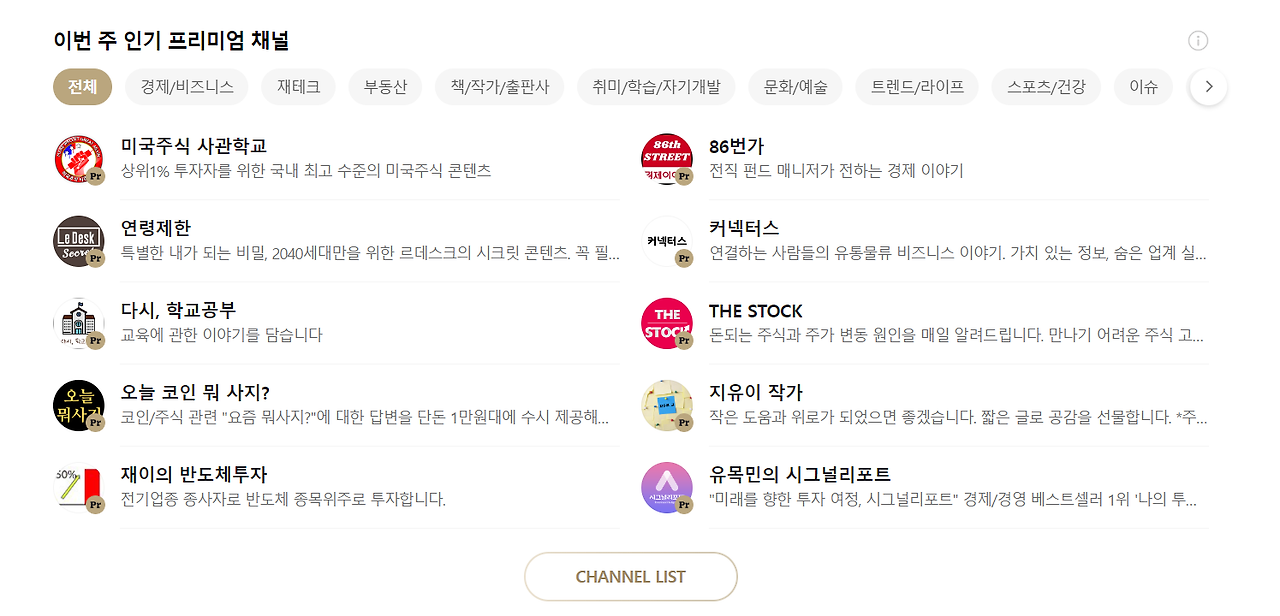네이버 프리미엄 콘텐츠의 인기 채널 목록입니다. 미국 주식, 경제와 사회 이슈, 교육, 코인, 반도체 투자, 경제, 유통물류 비즈니스, 에세이, 투자 리포트 등의 채널이 있습니다. 상위 10개 중 8개 채널이 경제, 투자 관련 주제를 다루고 있고 이 채널들은 구독료도 높은 편입니다. 그리고 상위노출 10개 채널 모두 첫 달 무료 구독 쿠폰 이벤트를 진행하고 있습니다. 진입장벽을 낮춰 구독자를 많이 확보하려는 전략인 것 같은데 후에 크리에이터 간의 출혈경쟁이 생길 여지가 있어 보입니다.