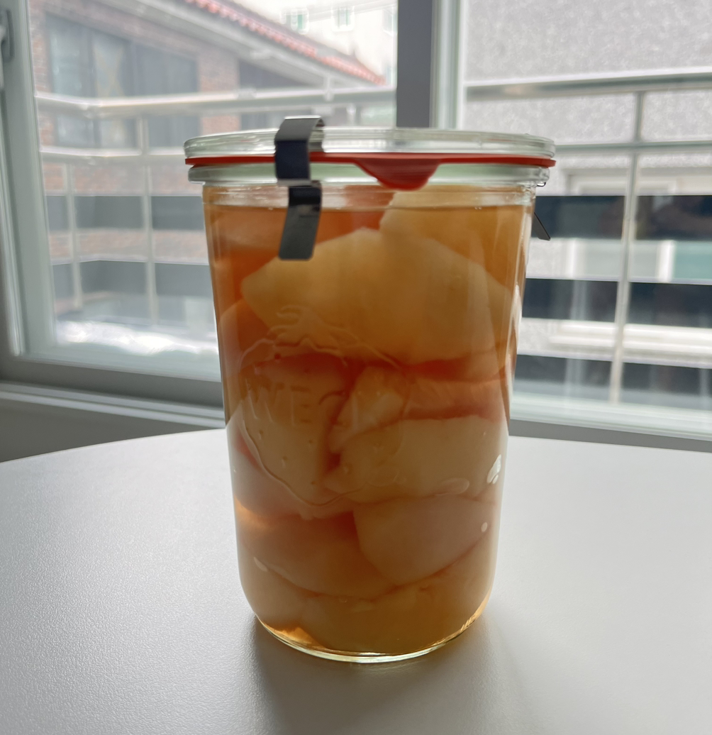 무른 복숭아로 병조림을 만들었습니다. 복숭아 향이 첨가된 홍차를 넣어서 만든 홍차 복숭아 병조림을 만들어 두었어요. 레시피도 없이 그냥 복숭아 3개의 껍질을 벗기고 적당한 크기로 잘라 물과 설탕 반 컵을 넣고 끓였습니다. 그 사이 3분 동안 진하게 우린 홍차와 레몬즙을 준비해 놓았다가 5분 정도 끓인 복숭아에 넣었어요. 열탕소독한 유리병에 복숭아를 옮겨 담고 밀봉한 채로 식혀 냉장고에 넣어뒀습니다. 그 후 한 달 정도가 지난 것 같아요.