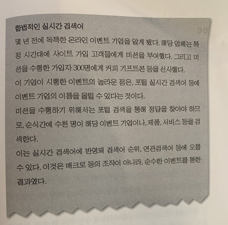『몇 년 전에 독특한 온라인 이벤트 기업을 알게 됐다. 해당 업체는 특정 시간대에 사이트 가입 고객들에게 미션을 부여했다. 그리고 미션을 수행한 가입자에게 커피 기프트콘 등을 선사했다. 이 기업이 시행한 이벤트의 놀라운 점은 포털 실시간 검색어 등에 이벤트 기업의 이름을 올릴 수 있는 것이다. (중간 생략) 미션을 수행하기 위해서는 포털 검색을 통해 정답을 찾아야 하므로 순식간에 수천 명이 해당 이벤트 기업이나 제품, 서비스를 검색한다. 이는 실시간 검색어에 반영돼 검색어 순위, 연관검색어 등에 오를 수 있다. (이하 생략)』 - 고객은 이런 뉴스를 검색한다 중에서 -