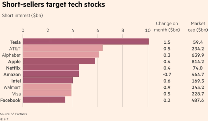 금융분석회사인 S3 Partners에 따르면, 테크기업들은 미국 주식시장에서 공매도 잔고 top 20개 중 절반을 차지하고있다. Tech10에 대한 공매도 잔고는 지난 달에만 14억 달러 증가한 410억 달러에 달한다.