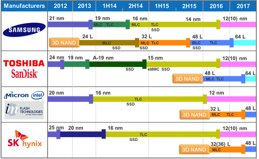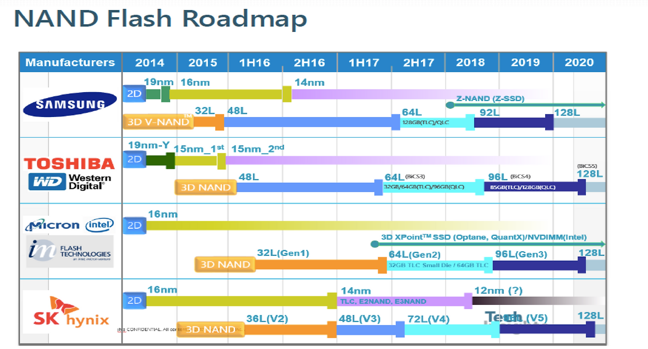 그림에서도 알 수 있지만, 3D 낸드 플래시는 2012년에 삼성전자에서 가장 먼저 투자를 전향해 공급하기 시작했다. 다른 반도체 경쟁사에서 미적거릴 때 시행한 과감한 결정이었다. 이는 CTF를 층층이 쌓은 것이었다. 결국은 2D 플래시나 낸드 플래시의 집적도에 한계에 이른 점 때문에 이를 적층으로 쌓아 올린 대안들이 기술적으로 등장하기 시작한 것이고, SK하이닉스는 2015년에 들어서야 본격적으로 공급하기 시작했으며, 기술적인 격차는 다소 있으나 최근에는 공정수준의 키맞추기는 하고 있는 상황으로 보여진다.