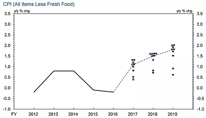 일본은행는 이번 회의에서 2% 물가목표 달성 시기에 관한 예상을 기존 '2018년 경'에서 '2019년 경'으로 미뤘지만, 아무래도 정책위원 대부분이 2019년도에서도 무리한 가능성이 높다고 보고 있는 것이다. 이래서는 중장기적인 예상 물가상승률에 영향을 주기는 어려울 것이다.