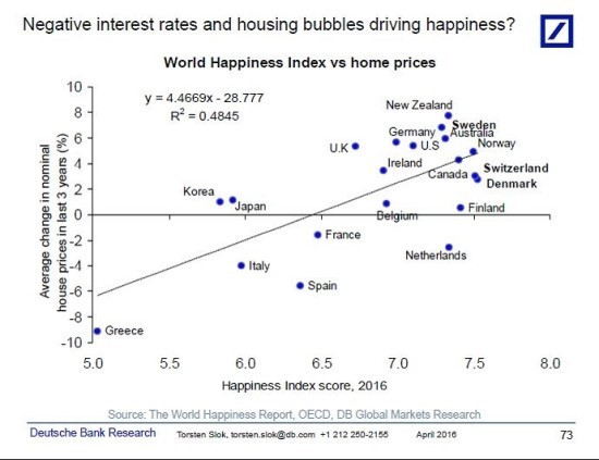 그림에서도 볼 수 있지만, 디플레 우려로 인한 자국경제 회복을 위해 마이너스 정책금리를 시행하고 있는 몇몇 나라들이 우측 상단에 포진해 있다. 낮은 금리 덕분에 오른 집값에 비례하여 행복지수가 상승한 것을 보여준 그림.