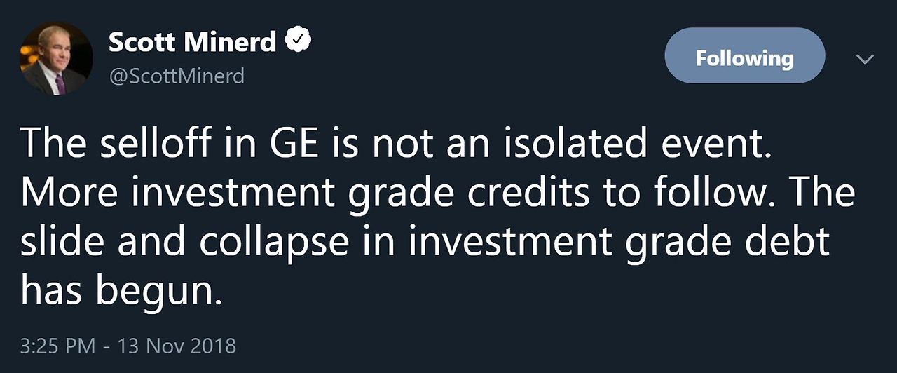 구겐하임 파트너스의 Scott Minerd, CIO 역시 그의 트위터에서 아래와 같이 경고하고 있다. GE가 투자등급 회사채 몰락의 시작이라고.